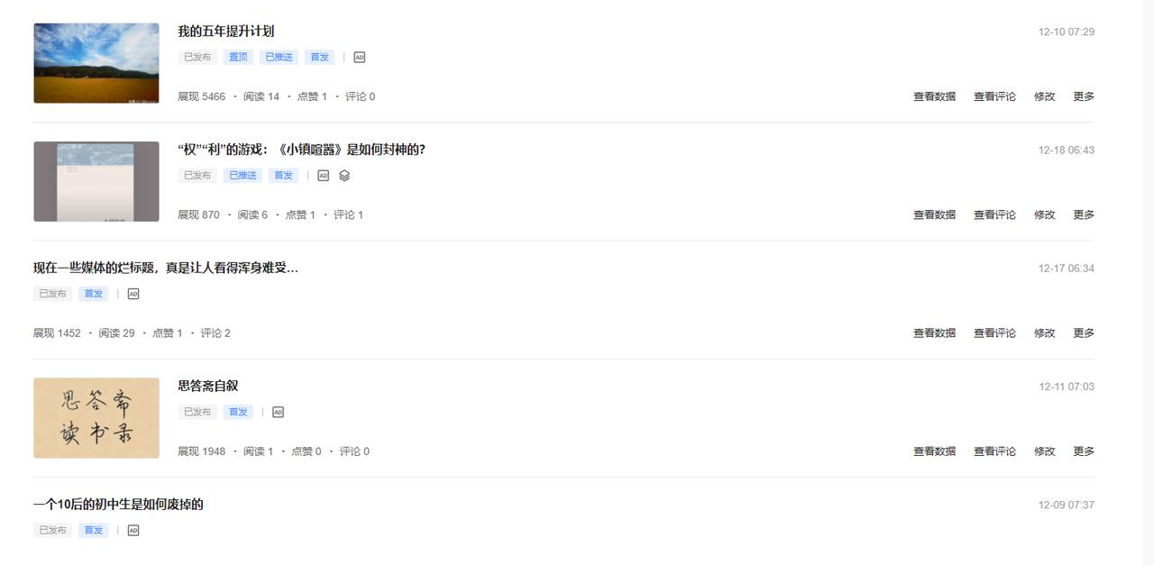 今天头条把我的首发权限取消了,理由是我写的内容涉嫌洗稿,天地良心,人在家中坐,锅从天上来,我算是体会到被冤枉的滋味了。 我发的每一篇文字,不管长短,全都是我一个字一个字敲出来的,目的是为了记录自己的生活点滴,看看自己每天的日子是怎么过的,同时分享一些自己的所思、所见、所感,如果这些东西涉嫌洗稿抄袭的话,那我真的怀疑这世界上是不是有一个和我同样的人, 现在在头条上发文其实基本没有收入,每天一分两分的,相信有很多人在这上边创作纯粹是为了热爱,没办法,已经熟悉和习惯这个平台了,这么多年下来,也有了感情。 但今天头条搞卸磨杀驴这一出,的确是伤我的心了,虽然我点了申诉,但我明白,一定不会给我通过的,就这样吧。 所以我决定从今天起,我的文章将不会在头条上发布,此账号以后仅作为我的日常朋友圈使用,什么激励计划、什么首发权益,爱去哪去哪吧,不再陪你玩了。 我的文章,再也不会在你这里发了。