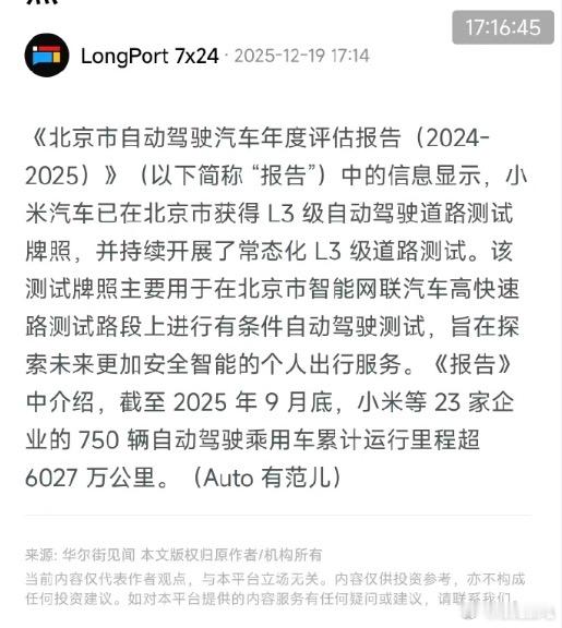 意料之中,小米的销量打脸了很多人,辅助驾驶也会打脸很多人,11月份,第一电动智驾测试,小米还拿了个第二,当时米黑都被小米辅助驾驶给震惊了,因为他在场还故意恶搞一下。看到小米拿到L3测试牌照,比较意外的是它竟然这么快。作为21年才入局的后来者,小米在辅助驾驶上进步确实快。行业里头部玩家基本都已拿到L3测试牌照,小米能迅速跟上,至少说明它在软硬件冗余、数据闭环这些基本功扎实。之前小米辅助驾驶L3负责人说过有人、有钱、有决心,跟进速度自然飞快现在看真不是空话,这背后还是砸钱砸人。而且,小米在AI上布局小十年了,今年研发加码超70亿,自动驾驶首期就投了近58亿,团队规模也到了一千八百多人。小米入局看似晚,但是,当一家公司把技术、人才、资金全压上,还摆出必须做成的态度,那它跑出来的速度,往往比我们想象中更快,这就跟它的销量高是一个道理。