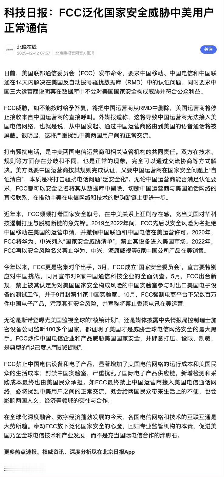 美国联邦通信委员会FCC对中国三大运营商发出了14天通牒,要求解决入境美国电信呼叫的备案问题,必须在规定时间内给出答复,否则将停止中方的呼入。国内媒体发表了一些评论,称三大运营商立刻进行了整改,落地美国的诈骗电话锐减了70%。并讽刺还是洋大人管用,国内常年解决不了的问题,被洋大人一个通牒就取得了突破。很遗憾这是胡说八道,我做个简要解读。第一,此事与电信诈骗无关。美国的基础电信业薄弱(相对于中国而言),电信诈骗没有技术土壤,不是个严重社会问题。但美国的银行系统非常发达,全世界40%以上的信用卡诈骗都出自美国。第二,美国联邦通信委员会所强调的是一个特定的电信行为,即由美国本地用户发起的国际呼叫,经过境外中转后又返回美国境内。根据国际电信规则,美国电信行业主管部门的这个要求非常合理,我国也有类似的国际电信业务的落地备案要求。第三,中国本地发起的对美国呼叫并且在美国落地的“半圈通信”,美国对此并不敏感,不要求备案。而要求由美国发起且在国外转一圈后美国落地的“整圈通信”进行备案,这事很有意思。为什么会有这个要求?我们正在研判其原因。但可以想象,美方认为“整圈通信”更加危险。第四,既然美方要求备案是合理的,为什么我们不配合?美方之前已经对其他外国运营商提出了备案要求,如果涵盖了我方运营商,那我们应该积极配合。但是,美方这次单独把中国运营商拉出来说事,造成了中国运营商威胁美国电信业的国际观感,我们认为有政治操弄,不会接受。第五,我们正在等通牒时间到,然后会跟美国联邦通信委员会讲理,甚至会对簿公堂。