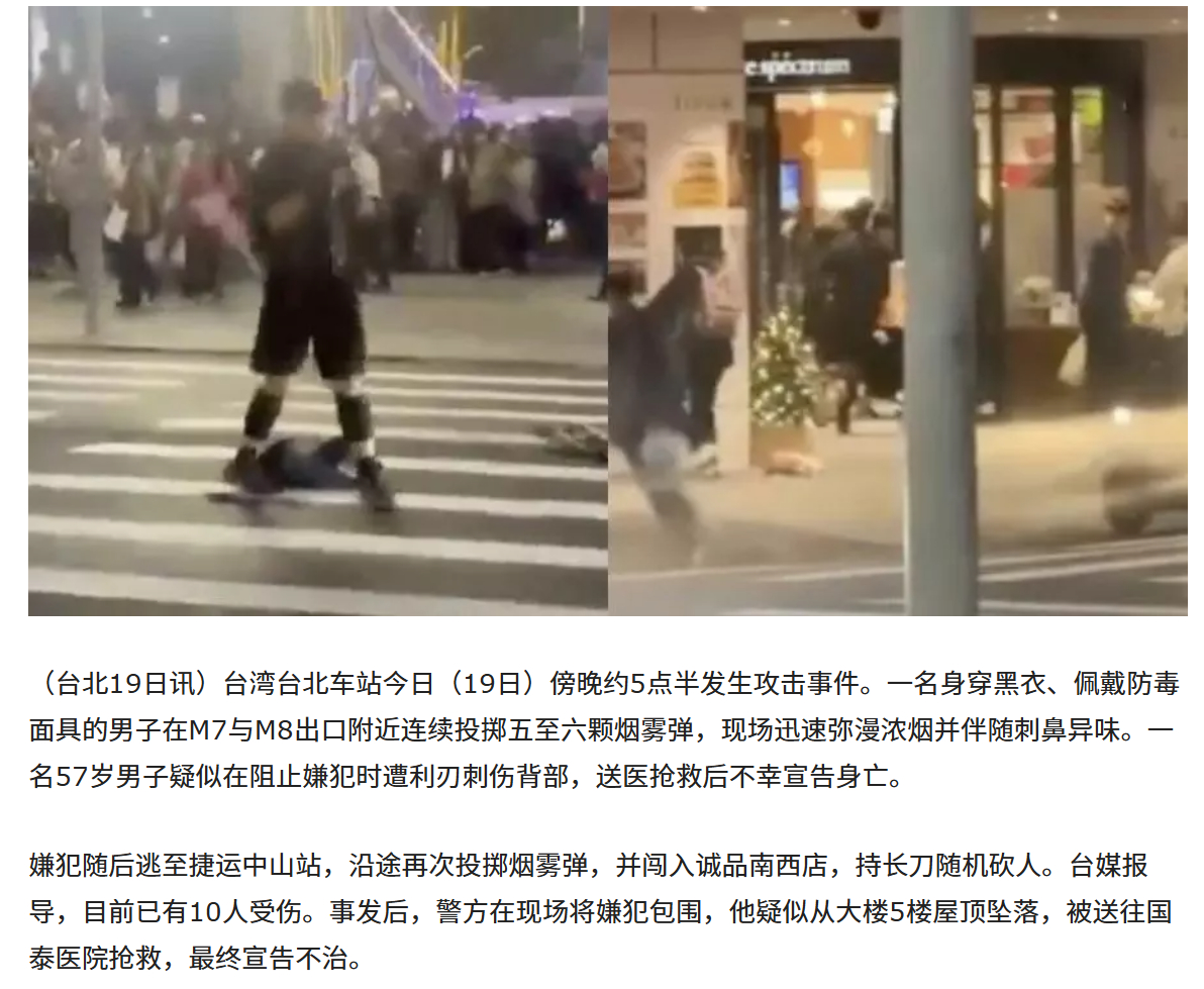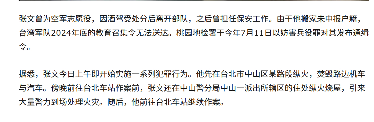 🔻张文曾为台湾空军志愿役,因酒驾受处分后离开部队,之后曾担任保安工作。由于他搬家未申报户籍,台湾军队2024年底的教育召集令无法送达。桃园地检署于今年7月11日以妨害兵役罪对其发布通缉令。🔻据悉,张文今日上午即开始实施一系列犯罪行为。他先在台北市中山区某路段纵火,焚毁路边机车与汽车。傍晚前往台北车站作案前,张文还在中山警分局中山一派出所辖区的住处纵火烧屋,引来大量警力到场处理火灾。随后,他前往台北车站继续作案。🔻造成3死10伤,警方在现场将嫌犯包围,他疑似从大楼5楼屋顶坠落,被送往医院抢救,最终宣告不治。台北车站袭击案已致3死6伤热点现场