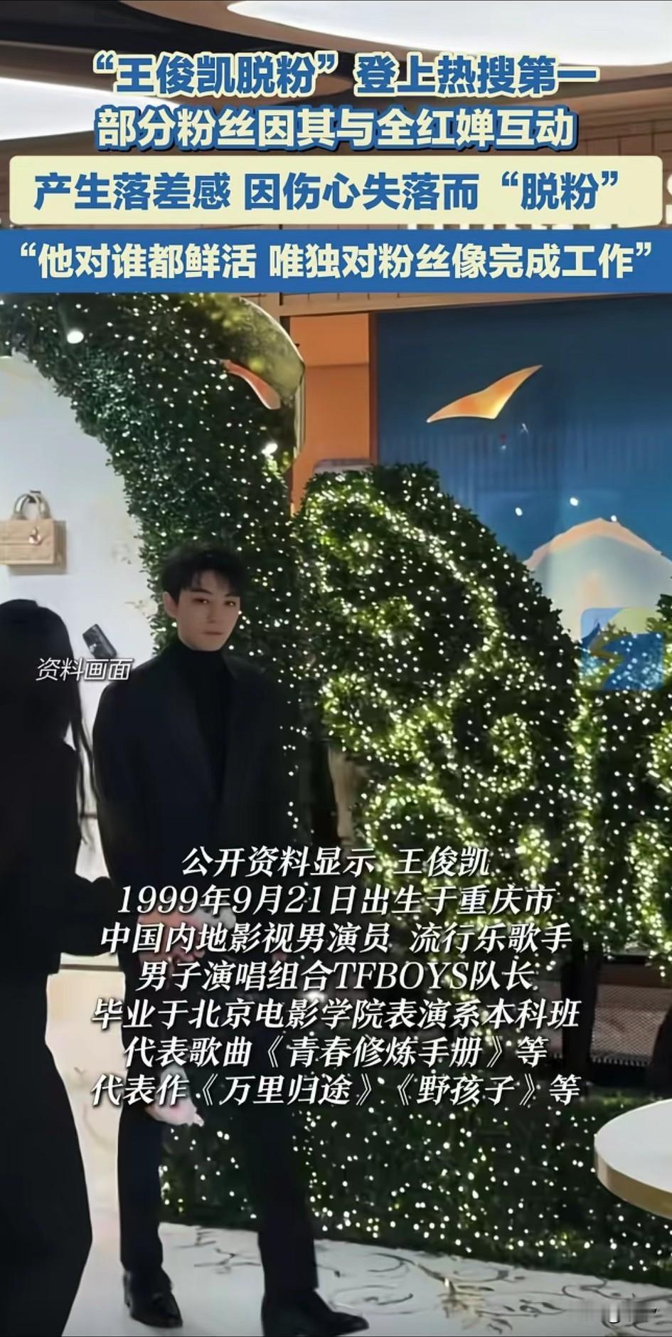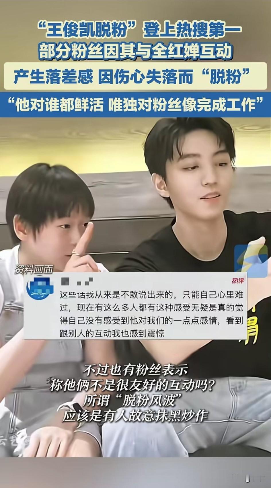 王俊凯脱粉火了, 原因是他与全红婵的互动, 让部分粉丝产生了落差感, 其实这部分粉丝纷纷脱粉, 有人借机大肆炒作, 本来两人互动还算可以, 但是有人表示两人关系并不好, 在一起互动完全是为了炒作, 王俊凯可以说是青少年的偶像, 奥运冠军全红婵也是, 可是两个人在一起却有很大的落差感, 一个是明星,一个是奥运冠军, 两者根本不在同一领域, 难怪网友表王俊凯对待谁都非常的鲜活,对待粉丝像完成任务一样, 明星就是明星, 粉丝就是粉丝, 明星和粉丝之间本身就有一条不可逾越的鸿沟,只是有些粉丝入戏太深, 大家对王俊凯脱粉这事怎么看? 王俊凯巴黎秀 王俊凯 王俊凯广告语 王俊凯明星赛