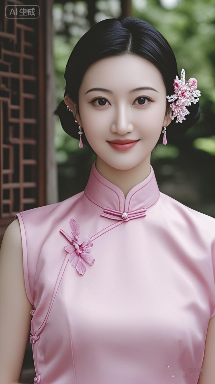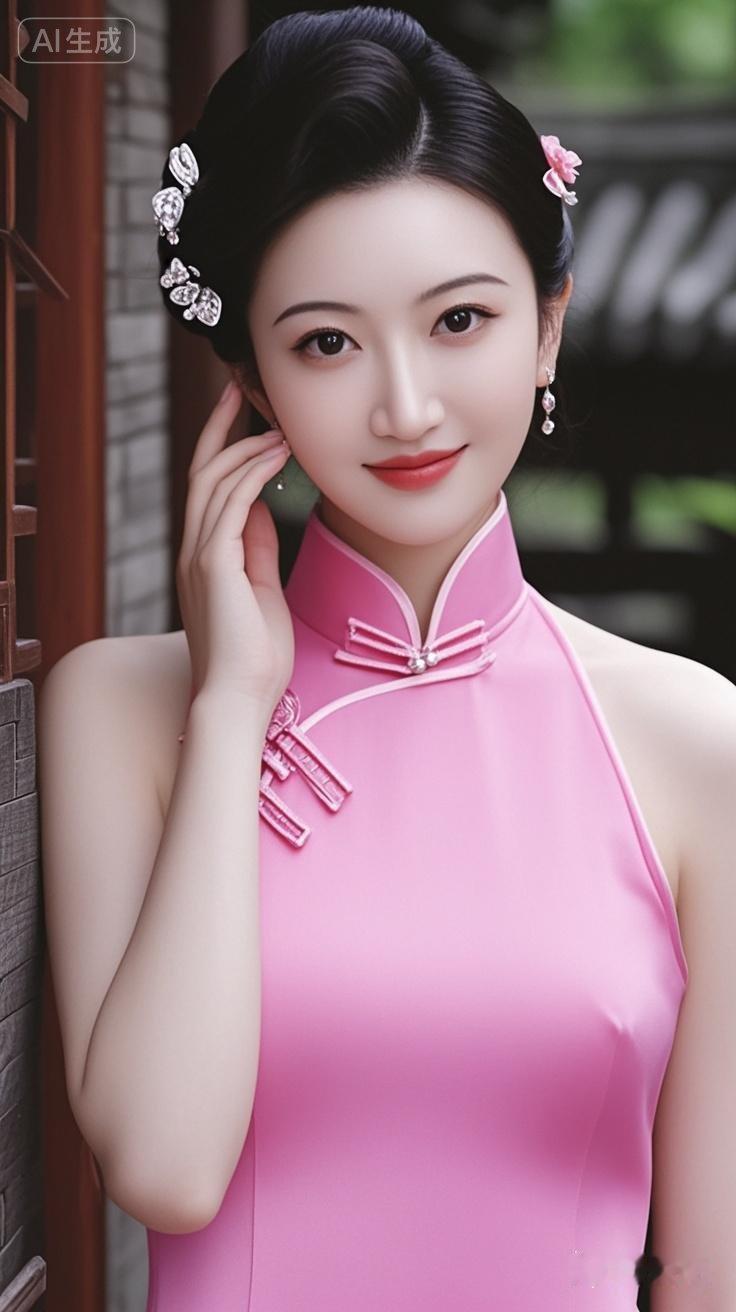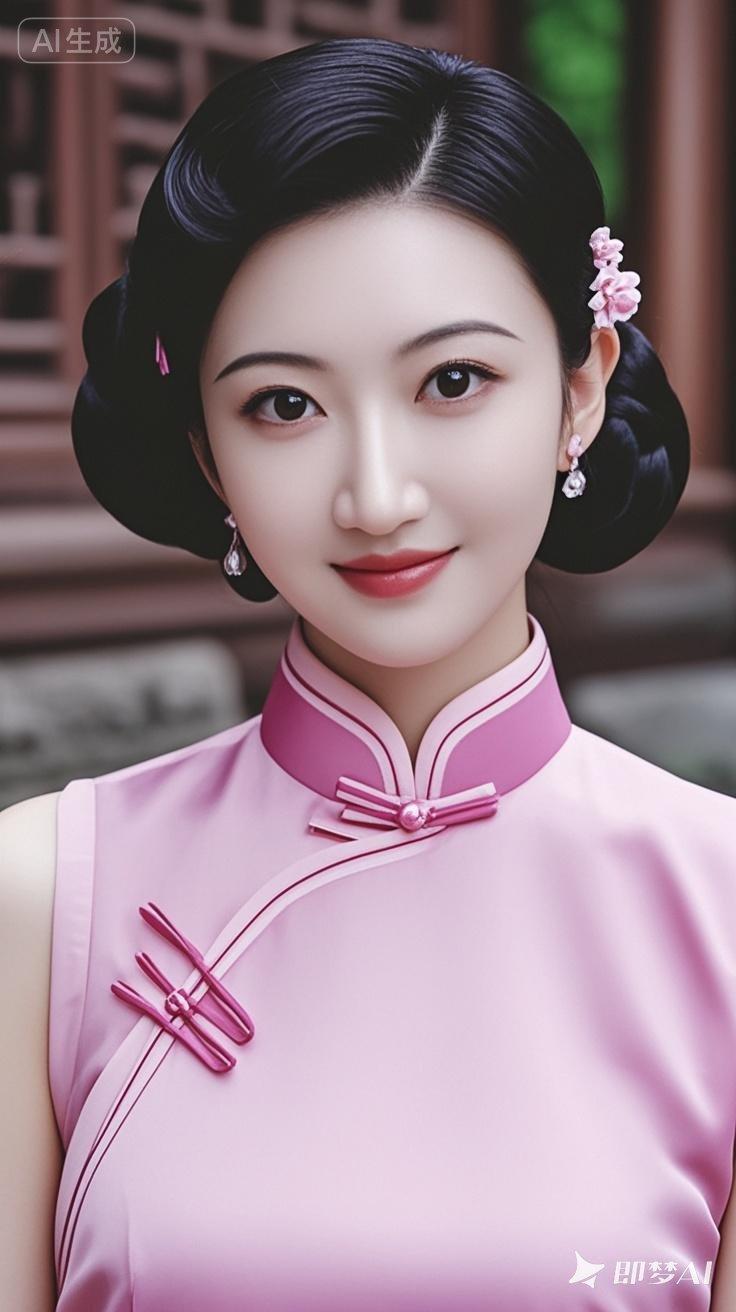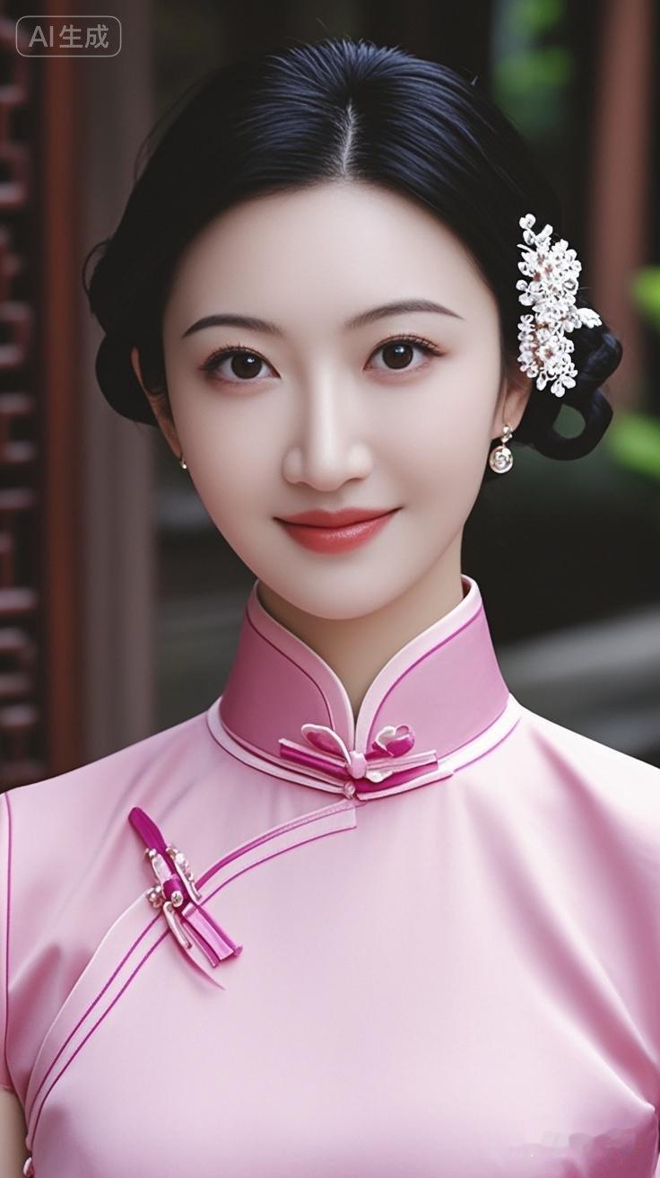 温柔粉色的旗袍,搭配精致的发饰,尽显东方古典美!