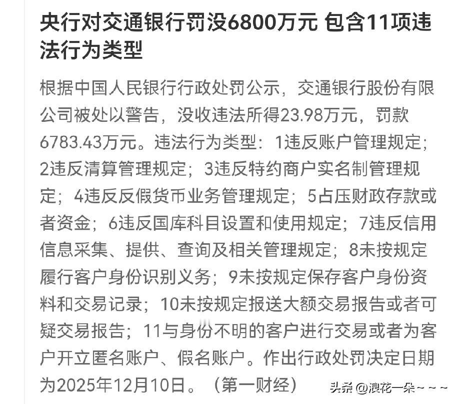 细思极恐?😨 据第一财经报道:交通银行有11项违法行为类型,被央行罚了6800万! 我仔细看了一下,每一项违法行为类型。虽然有的问题很专业,看不得很懂,但是第11项问题,我却感觉到有点不对劲,怎么会与身份不明的客户进行交易呢? 平时我们去银行里办业务不是都要出示身份证件的吗?而且现在去办理业务好多还都人脸识别呢,以前可能没有。当然了,更不能理解的是还有匿名账户和假名账户? 哎!我好疑惑,真是百思不得其解。当然了,交通银行可是上市公司,上市公司各项制度管理规定应该是更严格的,目前市值我看了一下6000多亿,股价7块钱左右。被处罚6800万可不轻啊。你们怎么看?