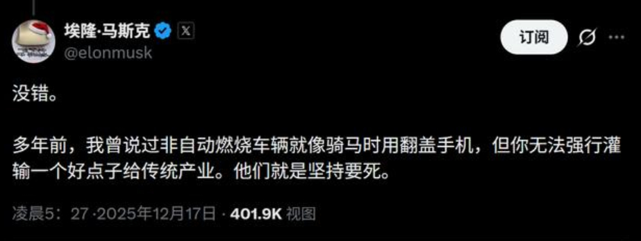 马斯克称非自动驾驶燃油车就像骑马时用翻盖手机 今日,CEO埃隆·马斯克在社交平台再次开火。有网友在评论区直言,很多传统车企推动电动车的逻辑,仍停留在“减少碳排放”层面,本身就暴露了对产业变革理解的滞后。马斯克对这条评论回复了四个字:“完全正确。”随后,他再次抛出那句已经成为话题中心的比喻——非自动驾驶的内燃机汽车,就是骑马时用翻盖手机。