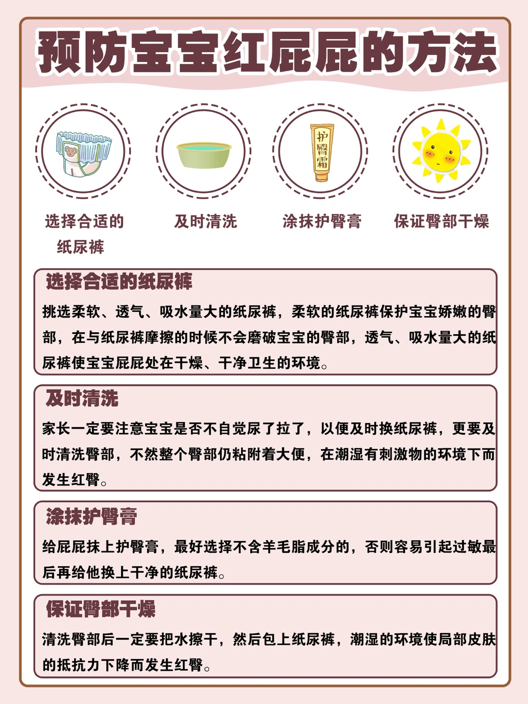 家长一定要注意宝宝是否不自觉尿了拉了,以便及时换纸尿裤,更要及时清洗臀部,不然整个臀部仍粘附着大便,在潮湿有刺激物的环境下而发生红臀。
