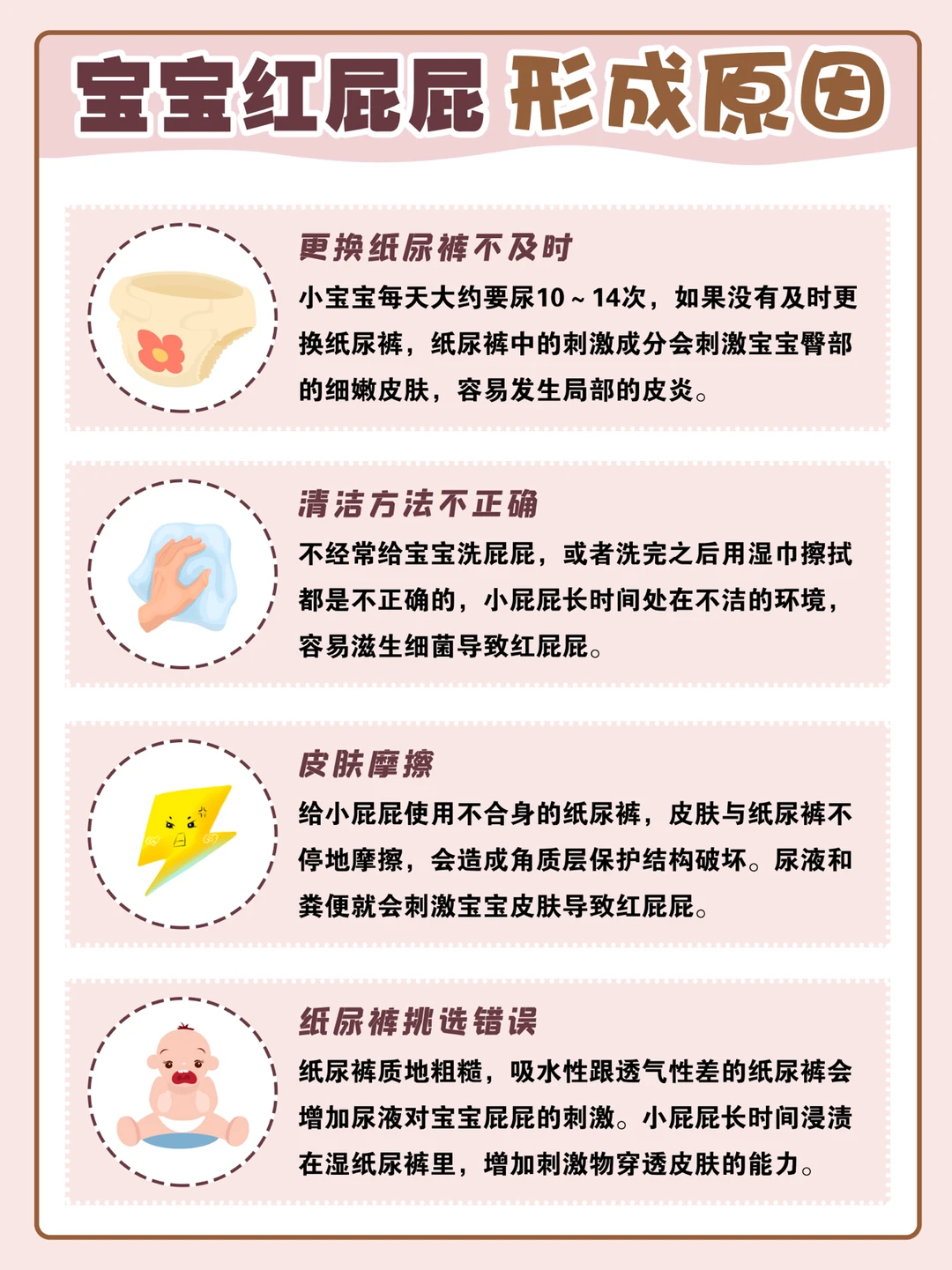 不经常给宝宝洗屁屁,或者洗完之后用湿巾擦拭都是不正确的,小屁屁长时间处在不洁的环境,容易滋生细菌导致红屁屁