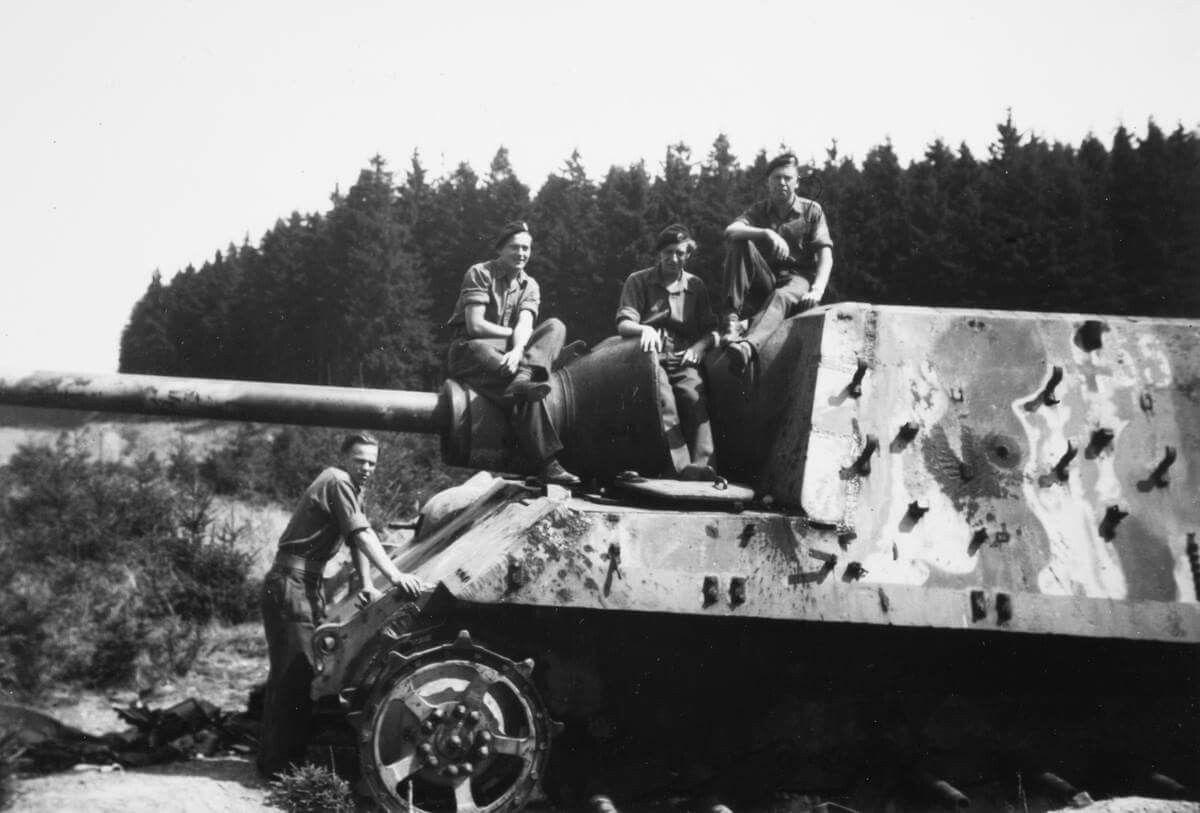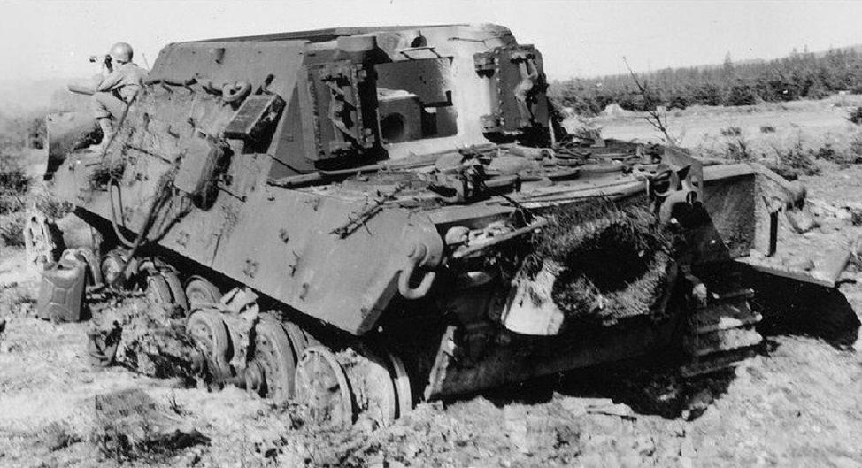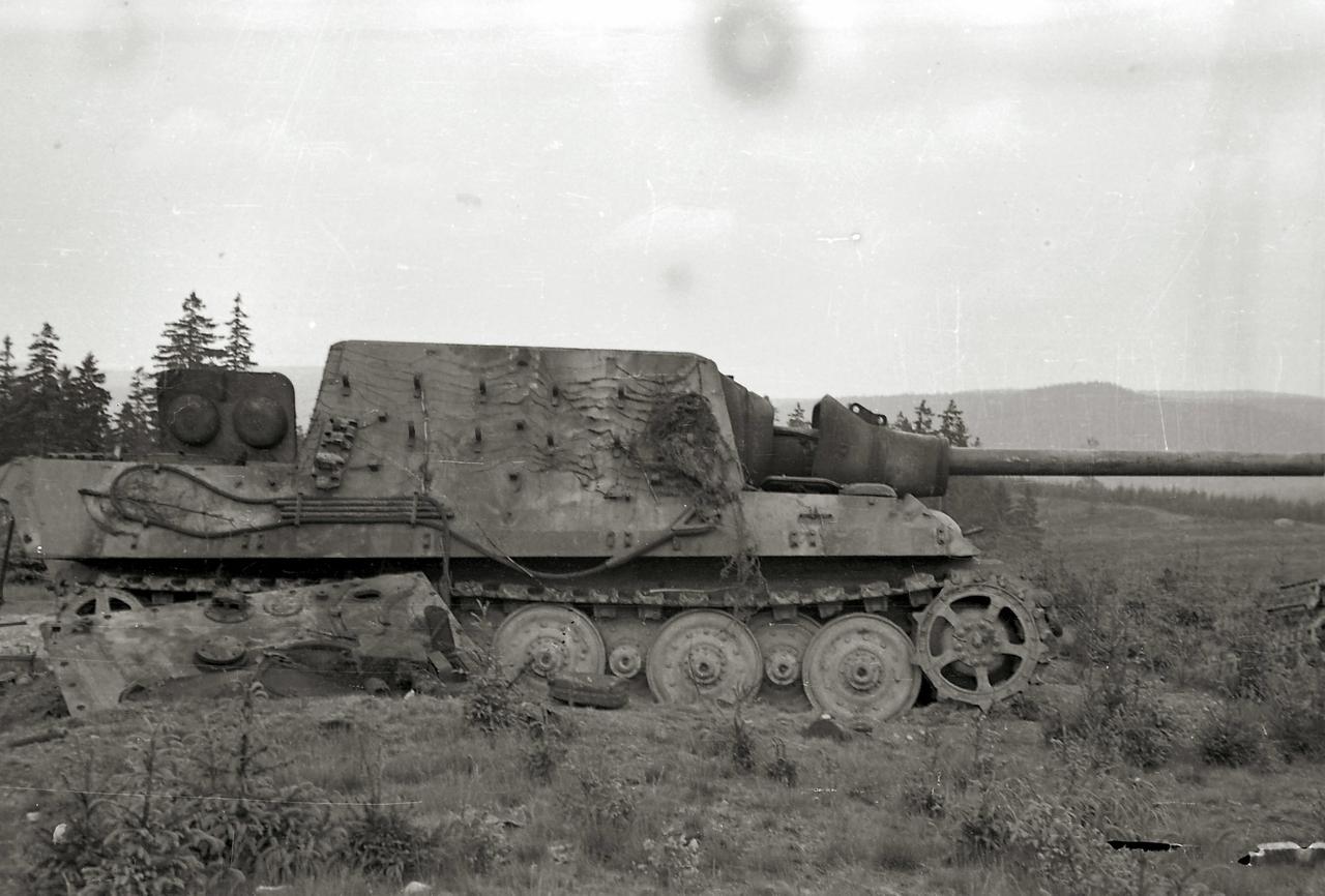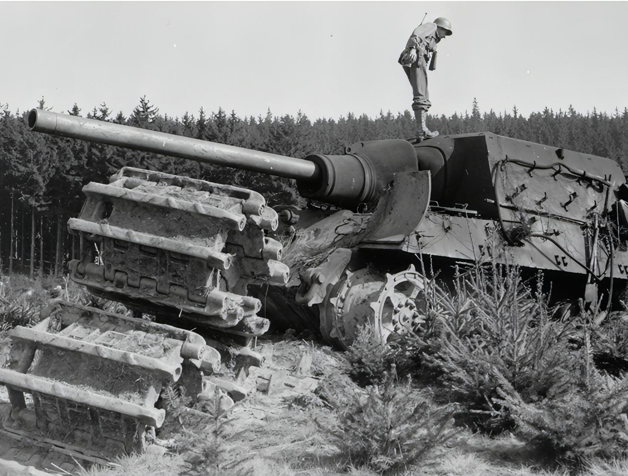 1945 年 4 月 15 日,德国圣安德烈亚斯贝格地区,一辆后期型 “猎虎” 坦克歼击车被摧毁。 该车采用亨舍尔底盘,配备 Gg24/660/300 型运输履带。关于其编制存在两种说法:一说隶属于第 512 重型坦克歼击营 3 连,另一说为该营 2 连。 需要说明的是,车体左侧的弹孔是在 “猎虎” 被摧毁后形成的。