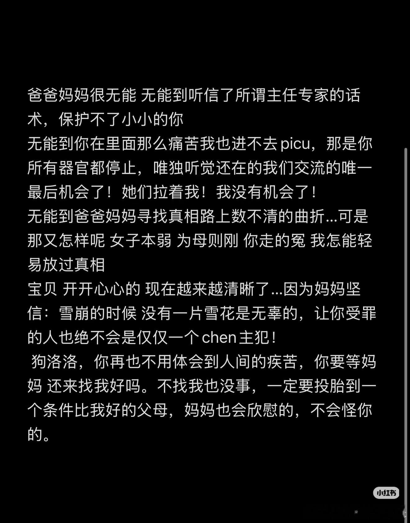 小洛熙一直以为遇到危险了就报警,警察会保护我们。被欺负了可以去法院,法官会给我们公证我的认知里小洛熙这样的事情,应该是有关部门主动协调,主动解决,主动给家长一个交代。但我现在看到的这些到底怎么了?假设一锅饭里有一粒老鼠屎,最简单最正常最正确的一个做法就,是把老鼠屎挖出来丢掉,以免污染整个饭。但我看到的却好像是整个厨房,一直花很大的精力和代价,当着所有人的面把这粒老鼠屎硬控成一粒米饭。这是违反常识的,那背后到底是什么原因,要如此费尽周折????我想每一个人心中都有这种疑问,这种疑问可大可小,如一粒种子,种在每一个人的心里。最终会发展成什么样子?那就看这件事情到底怎么处理了。这对天下所有父母,所有想结婚,想生孩子的人来说绝对是一场社会性创伤,这个创伤需要真相和公道才能愈合