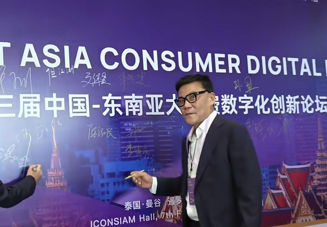 李国庆受邀到泰国曼谷参加活动了,作为电商行业的代表,参加第三届中国—东南亚数字创新论坛。 李国庆穿着职业装,带着参会证件,在墙幕上签了自己的名字,然后侃侃而谈,讲话分享的时候依然自信满满,并分享了图书领域的见悟和理解,还用幽默的话语讲述了儿子网购的事。 李国庆现场和大家进行了合影。