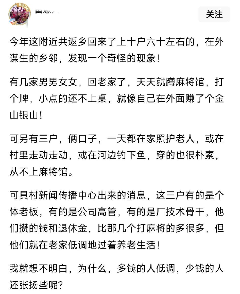 为什么,农村现在钱多的人低调,少钱的人反而还张扬些呢?农村的打工人回老家最起劲的