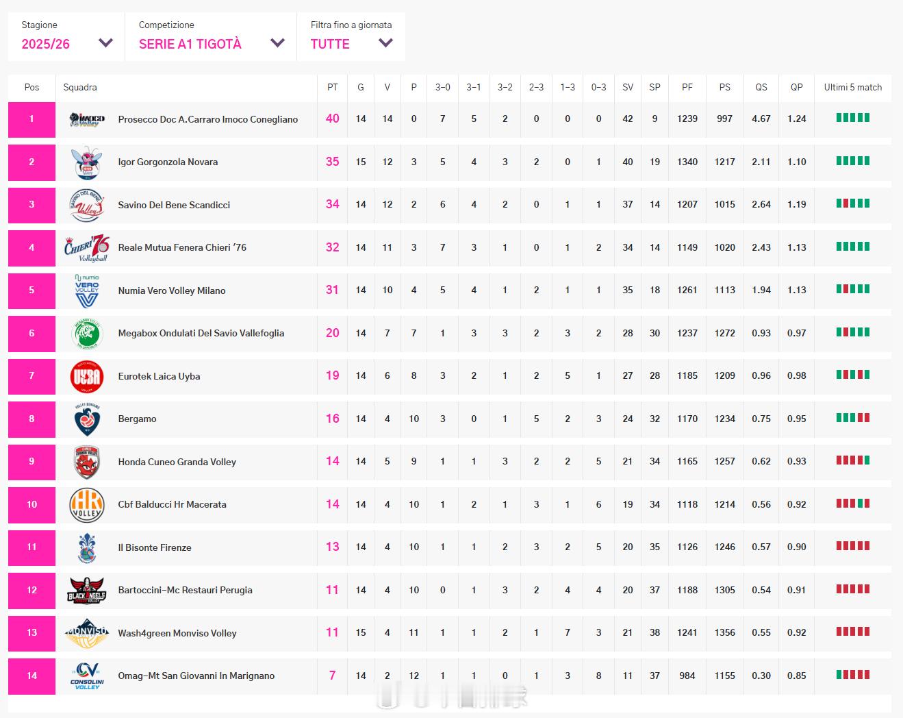 女排意甲常规赛14轮过后,庄宇珊加盟的升班马圣乔瓦尼2胜12负积7分在积分榜