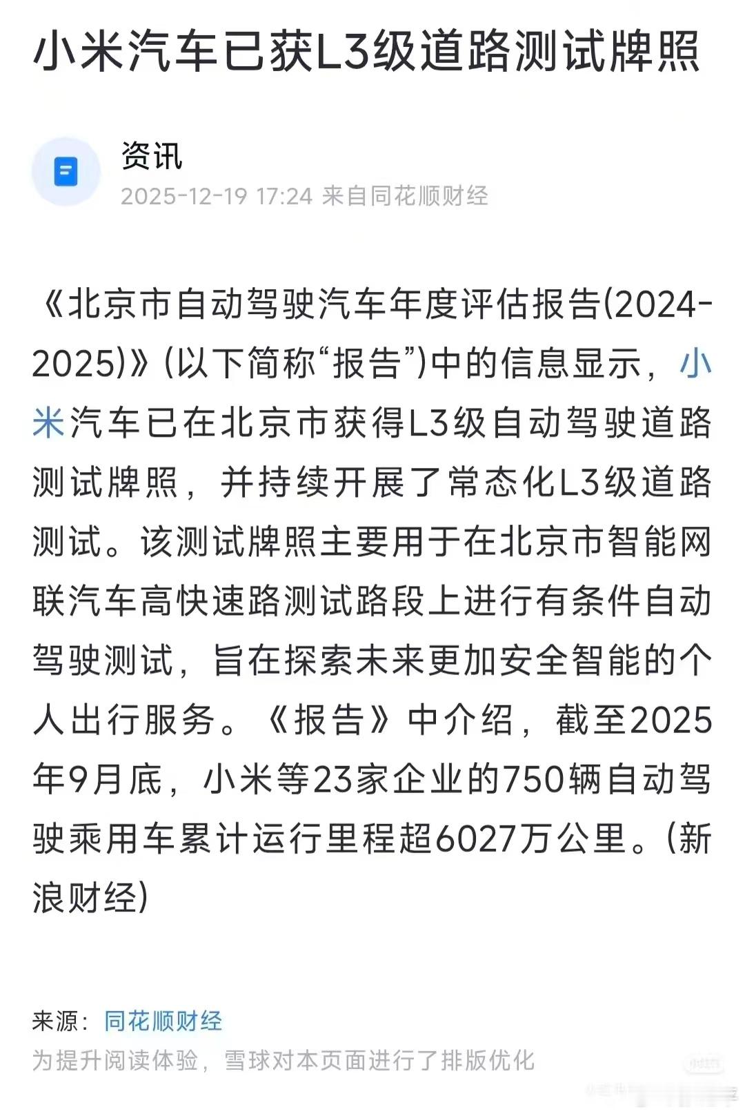 小米汽车获L3级自动驾驶路测牌照L3是一个新战场,头部车企是必定参与的。别看在此之前市占率高的品牌和车型不一定以智驾为核心卖点,以后可不一定了。因为L3是个分水岭,从政策上来解决“好用、敢用”的问题最直接。当然这一天来得不会太早,但进场越晚越没优势。和汽车行业电动化转型异曲同工。新能源汽车