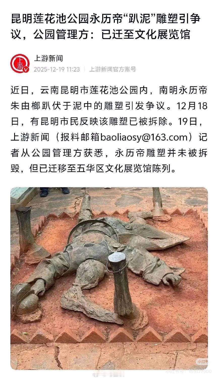 马踏南明永历帝朱由榔雕塑被移除后续:已迁至文化展览馆。如果设计者的初衷是为了体现南明最后一位皇帝在铁蹄下的惨状,那也能理解。