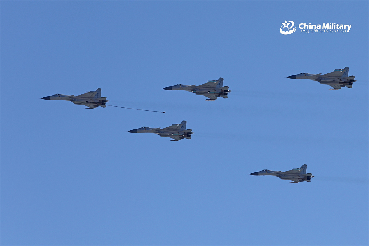 海航大歼-15好图飞鲨凌月、伙伴加油/编队飞行、滑跃起飞等机腹挂两中距弹的图似乎