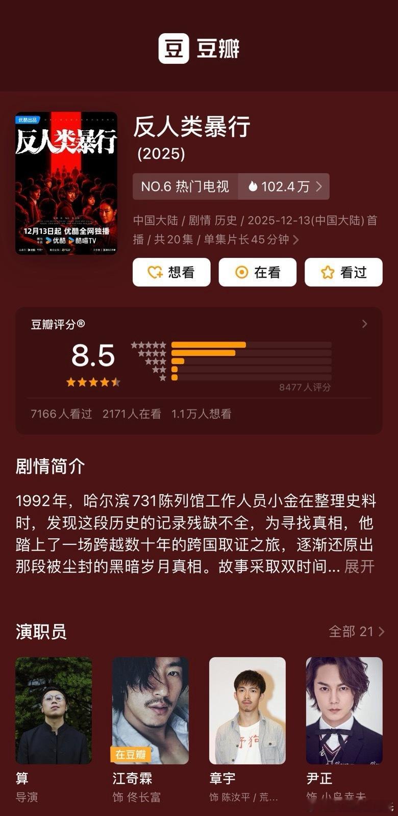 反人类暴行豆瓣开分8.5评分人数8500五⭐️占比最高46.5%四⭐️占比40%三⭐️占比8%二⭐️占比3.3%一⭐️占比2.2%反人类暴行豆瓣开分8.5