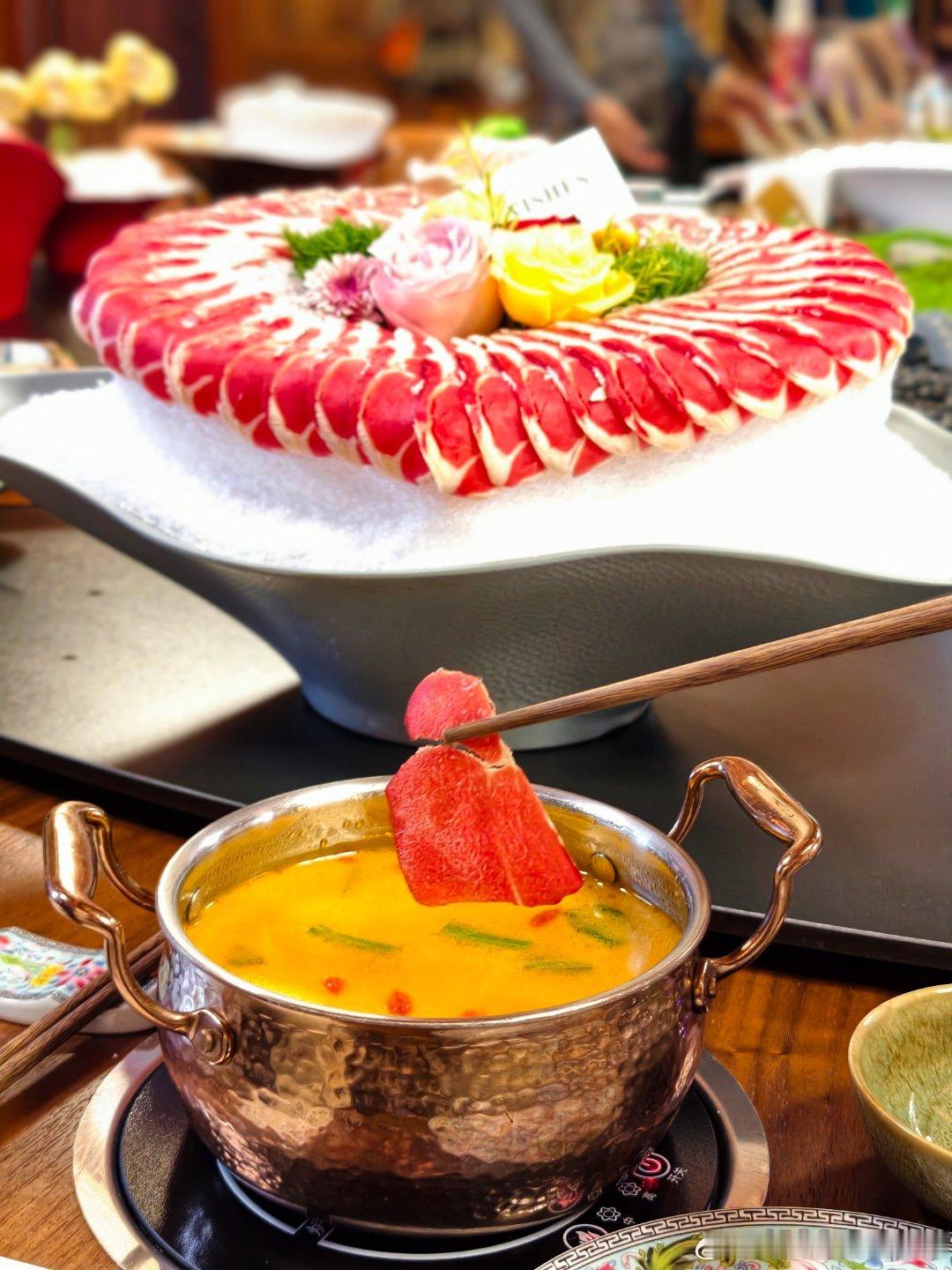 云南香格里拉|我被这口酸汤牦牛肉火锅彻底拿捏了在香格里拉,吃牦牛肉真的绕不过去。但真正让我记住的,是在朗嘉岭遇到的那一锅酸汤牦牛肉。第一次来朗嘉岭,本来冲着“高原牦牛肉”来的,结果直接被酸汤锅底圈粉。不是那种工业感很重的酸,而是清爽、开胃、越煮越香的酸,喝一口整个人都暖了。这里的牦牛肉,来自海拔3000米以上的香格里拉高原自家牧场,散养3年以上,吃天然牧草、喝雪山融水。肉切得很薄,下锅几秒就能吃,紧实但完全不柴,入口还有一点点淡淡的奶香。放进酸汤里涮,比清汤更有层次,肉香被酸味托得特别干净,完全不膻。🫕 我心中的必点组合:酸汤牦牛肉锅底:真的强烈推荐!越煮越香,喝汤都停不下来鲜切牦牛肉片:薄、嫩、弹,怎么涮都好吃高原冷水鱼:鱼片吸饱酸汤,鲜到不行高原豌豆苗:脆嫩清甜,解腻神器青稞面:最后下锅,裹满汤汁一口入魂很加分的一点是,这家店的仪式感真的很足。所有菜品都包装得像礼物一样,铜锅一上桌,热气腾起,瞬间有种“高原餐桌”的庄重感。吃着吃着,卓玛小姐姐们还会跳起藏族舞,动作轻盈又自然,不是表演式的热闹,而是那种很生活化的藏地氛围。一边吃热乎乎的火锅,一边看藏舞,真的很香格里拉。📍地址:香格里拉市独克宗古城,滨俪来民宿对面⏰时间:11:00–23:00雪遇云南香格里拉旅居迪庆雪遇香格里拉冬季到云南来旅居 香格里拉·朗嘉岭