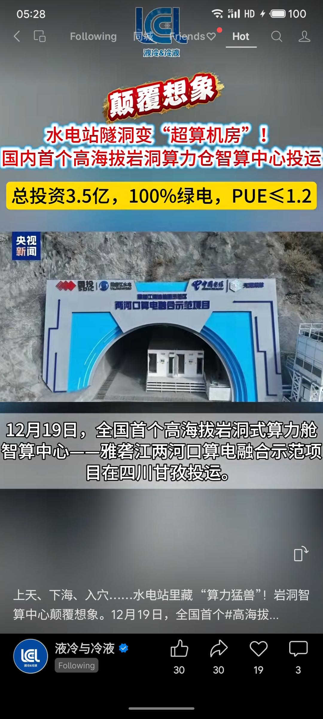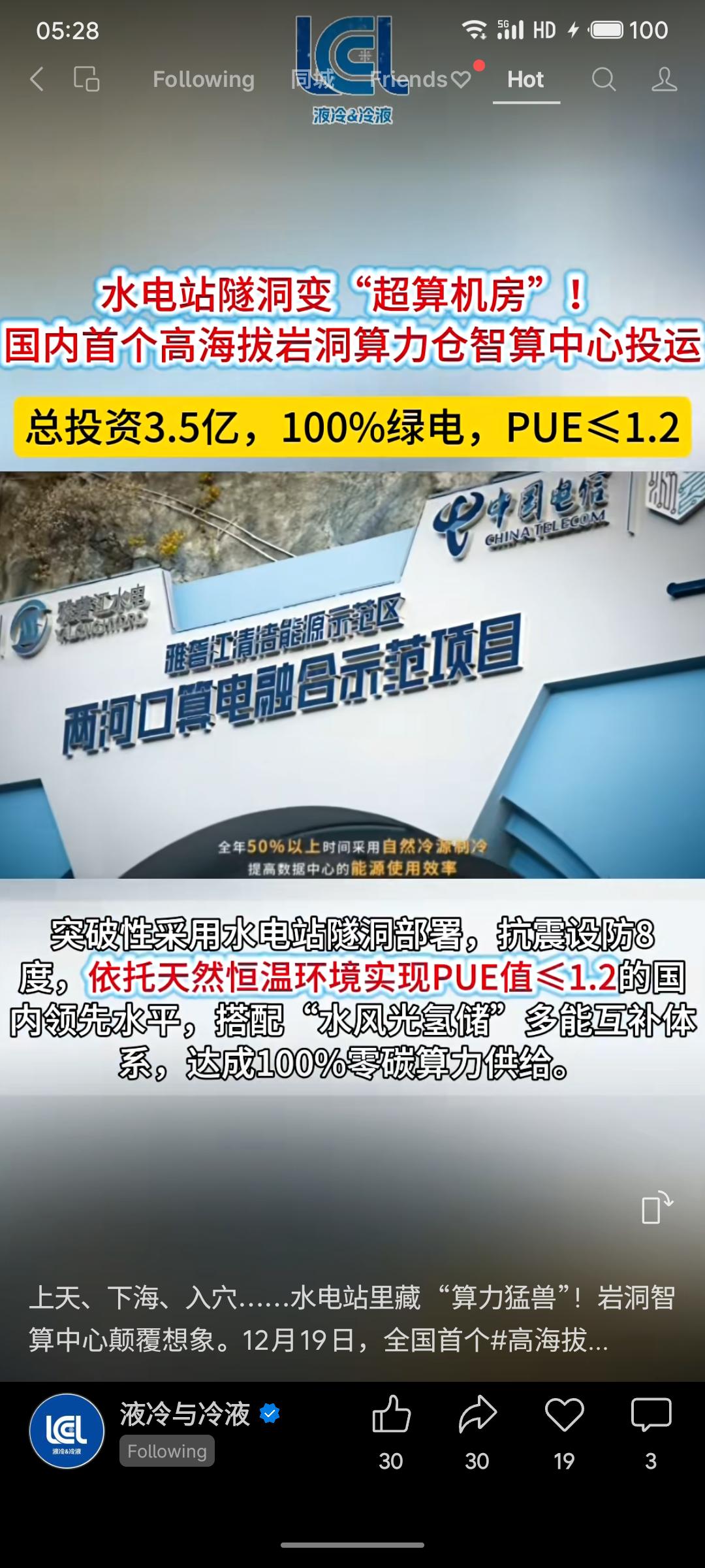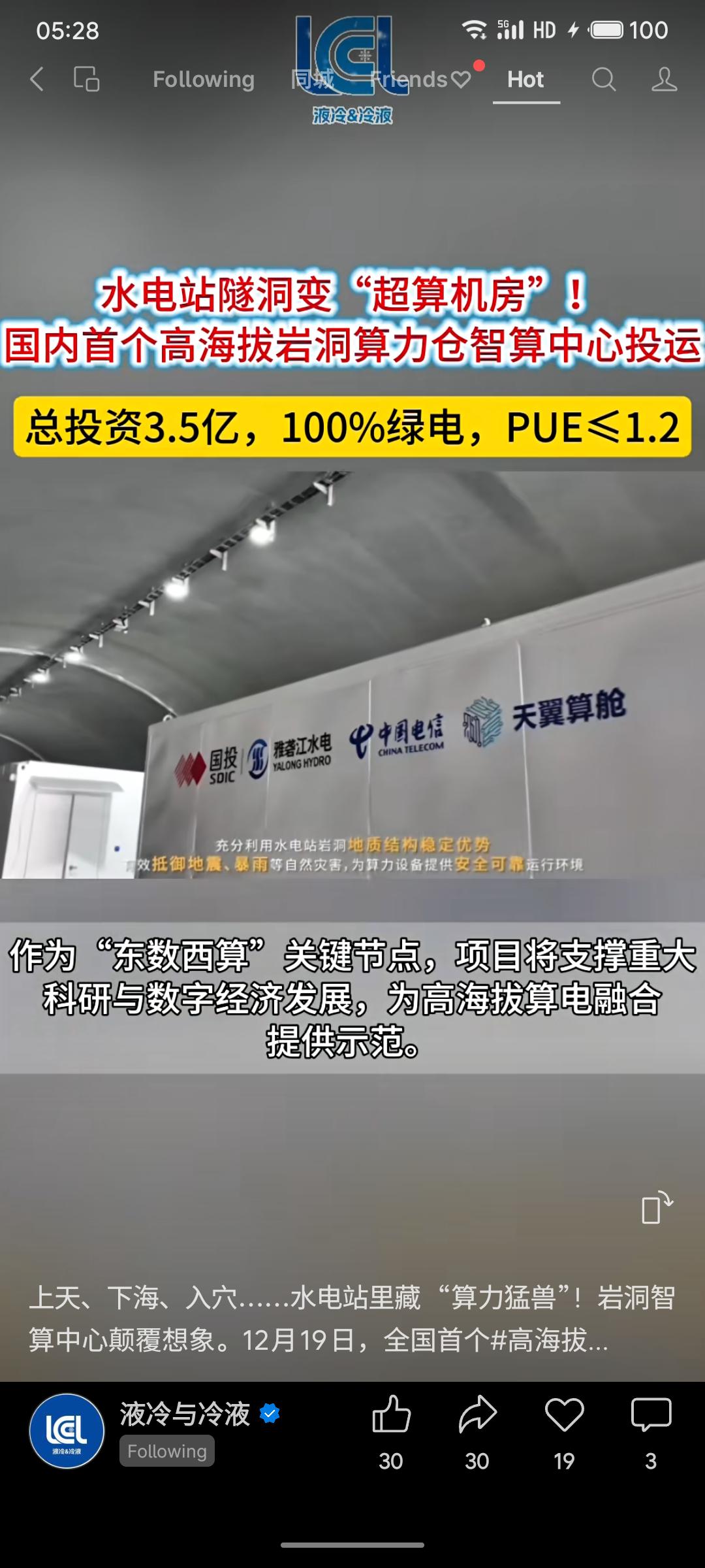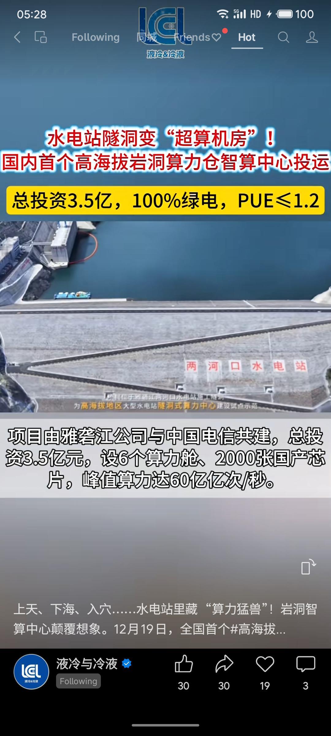 四川甘孜投运全国首个高海拔岩洞智算中心。该项目由雅砻江公司与中国电信共建,投资3