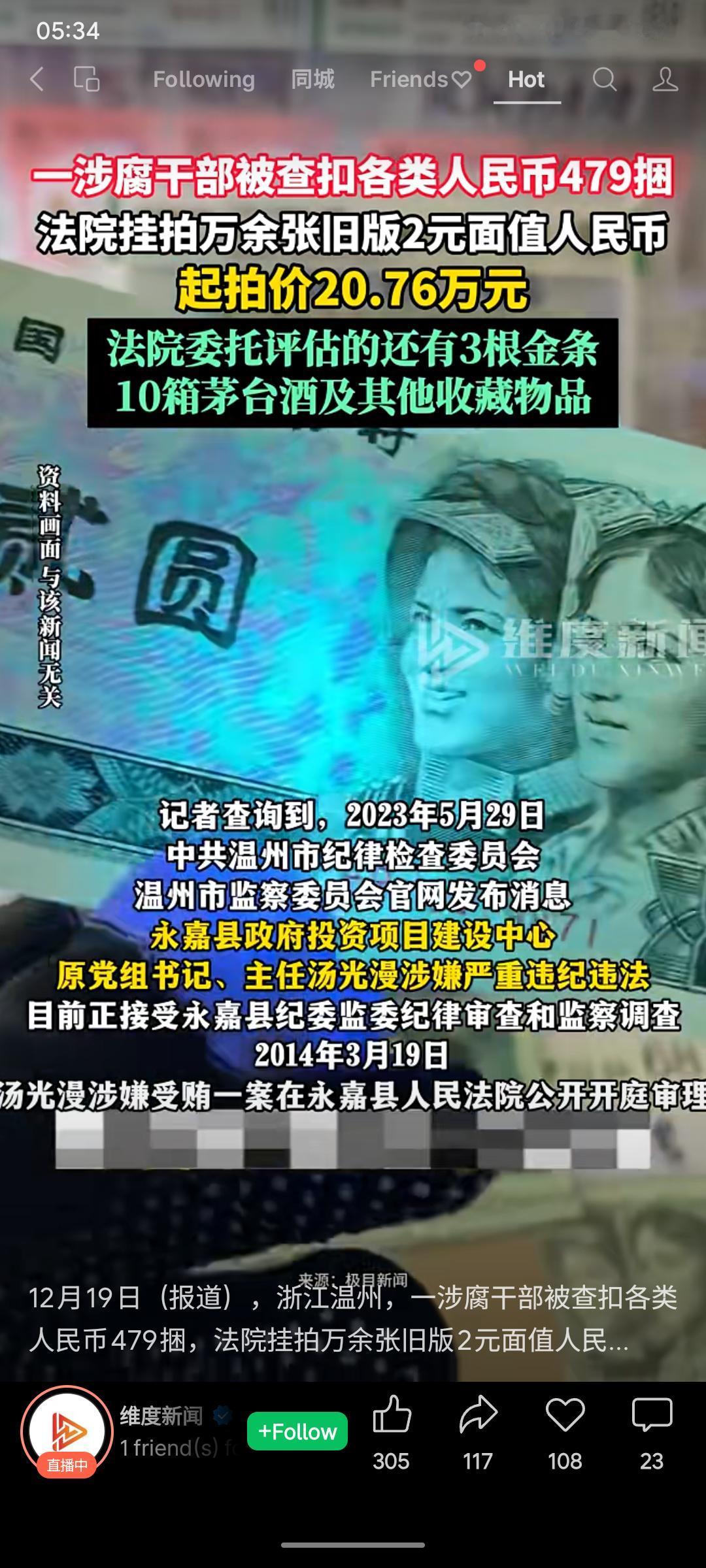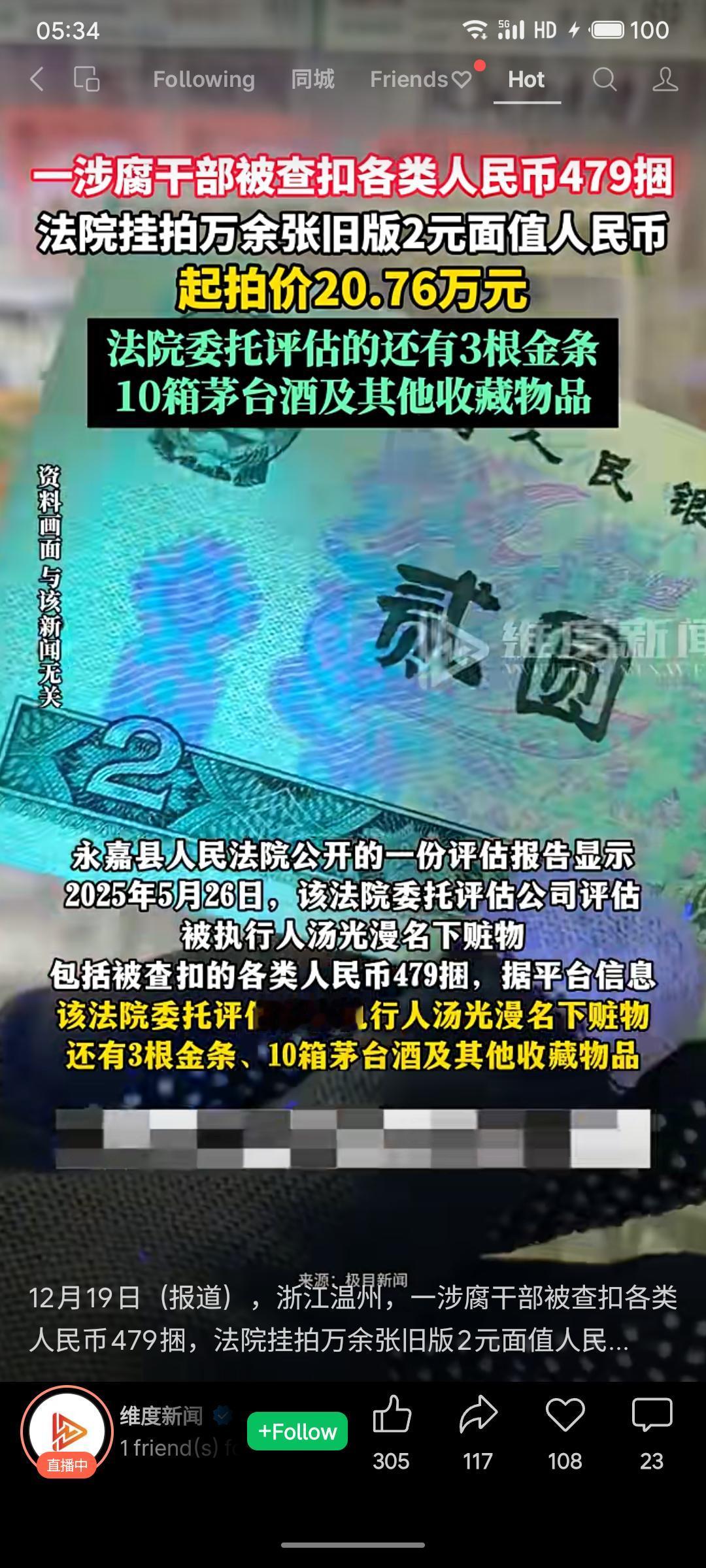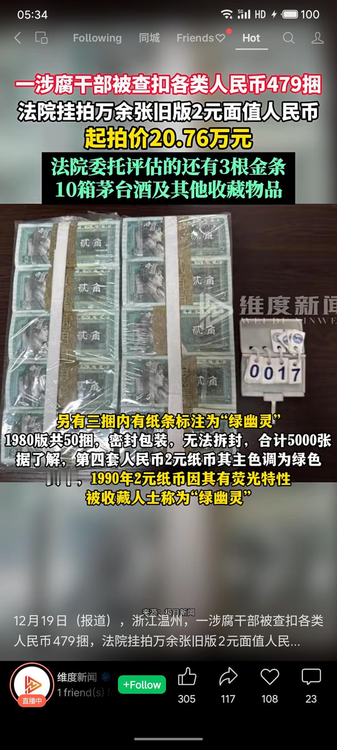 浙江永嘉涉腐干部汤光漫被查扣人民币479捆及金条、茅台等财物。法院近期挂拍其中10500张旧版2元人民币(含“绿幽灵”等稀有品种),起拍价20.76万元。该案于2023年由纪委监委调查,2024年开庭审理。