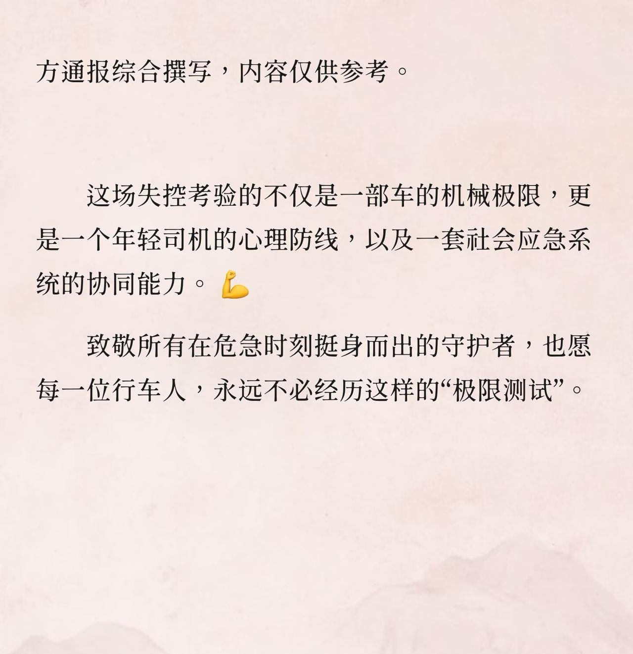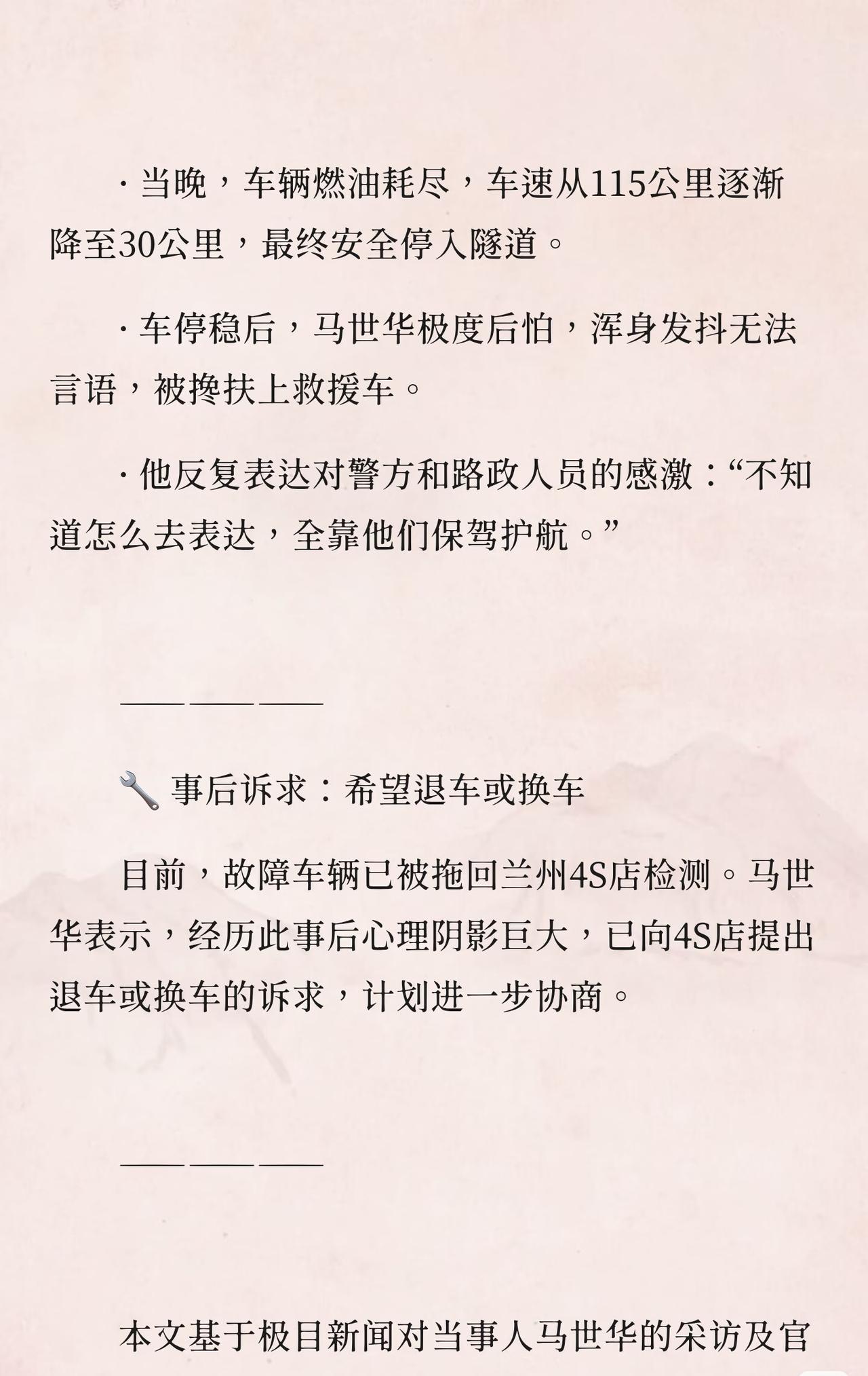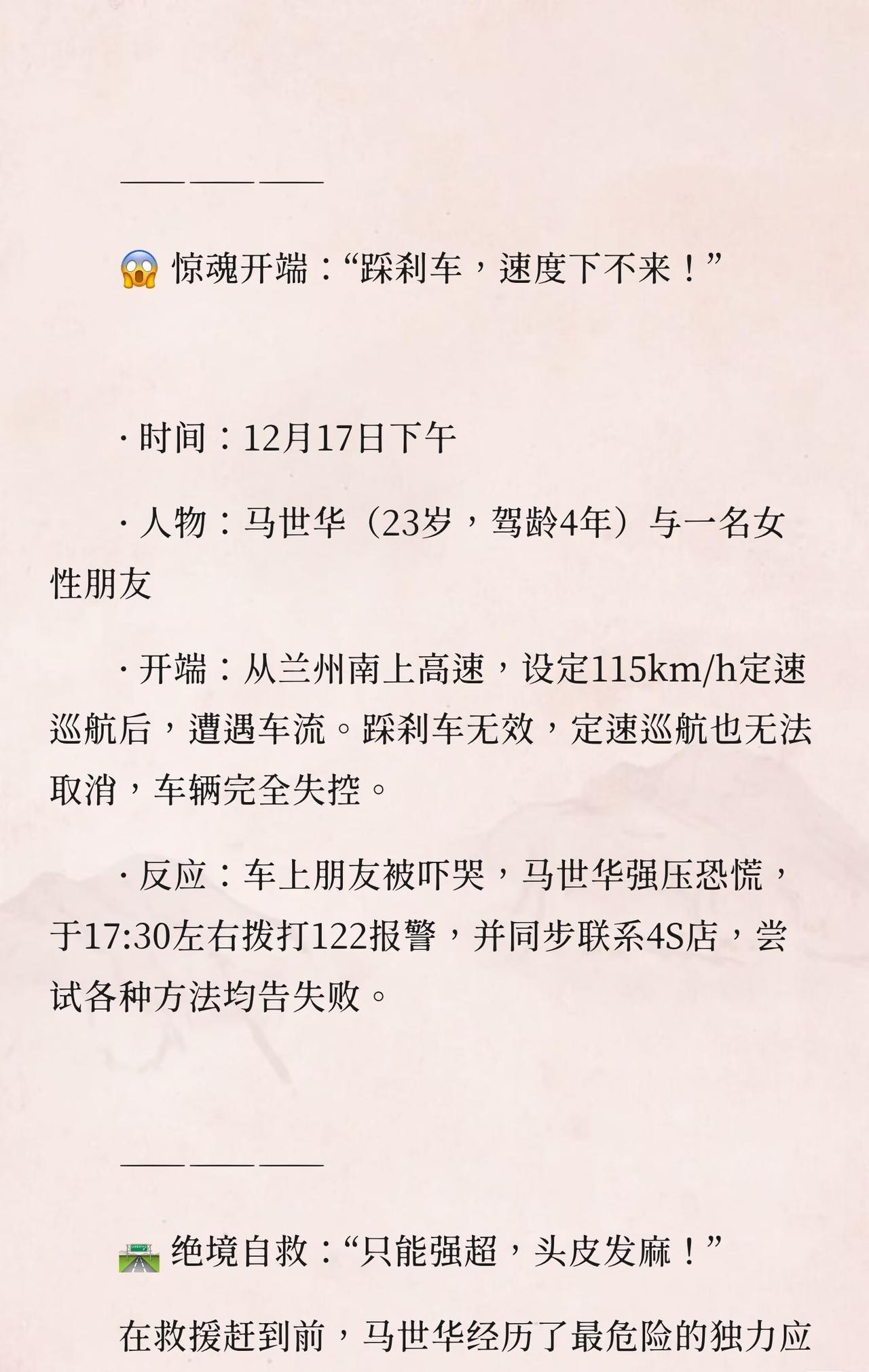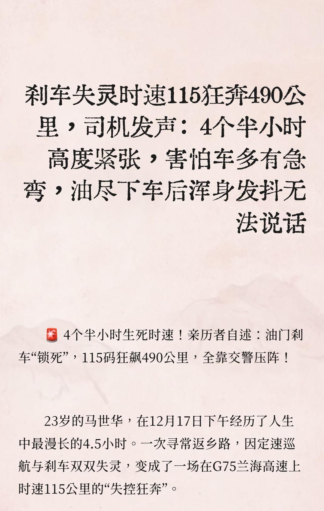 又是一起车辆刹车失灵? 4个半小时生死时速!亲历者自述! 在高速上因定速巡航与刹车失灵失控,时速达115公里,险象环生。经过4.5小时的紧急救援,最终在交警护航下安全停车。事件引发对车辆安全和应急响应系统的反思。
