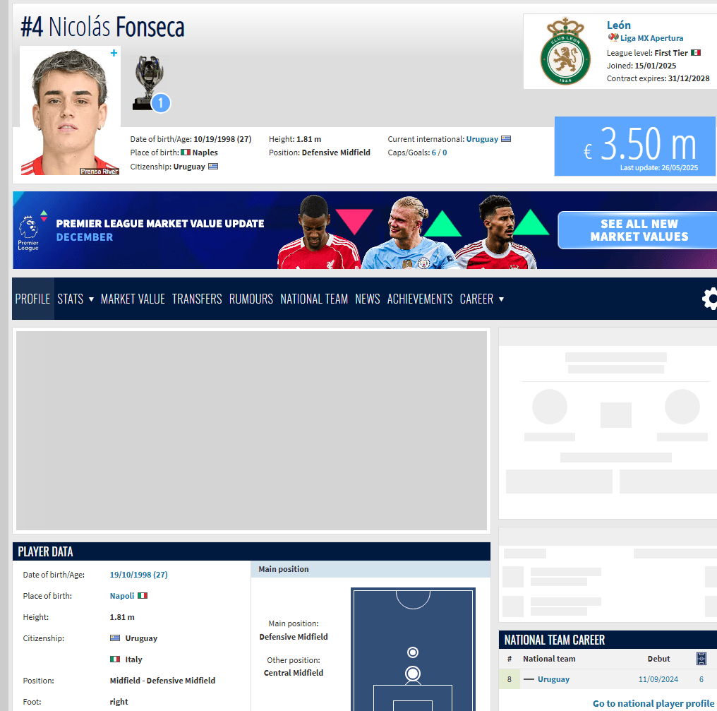 无论如何,种种迹象表明丰塞卡将在本转会窗口离开莱昂,这将使俱乐部腾出一个外援名额(目前九个外援名额已满),并为一名左脚中后卫腾出空间——这也是在2026年春季联赛的引援重点之一。