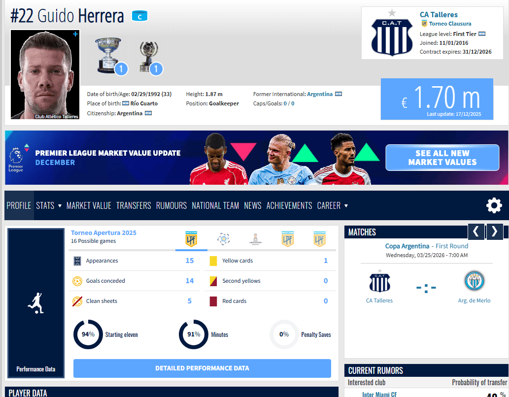 虎扑12月20日讯阿根廷球队塔勒雷斯已经接受了迈阿密国际对吉多-埃雷拉的报价。