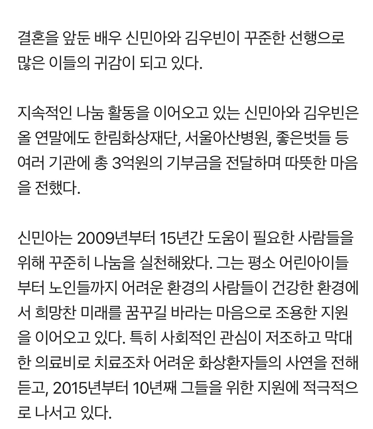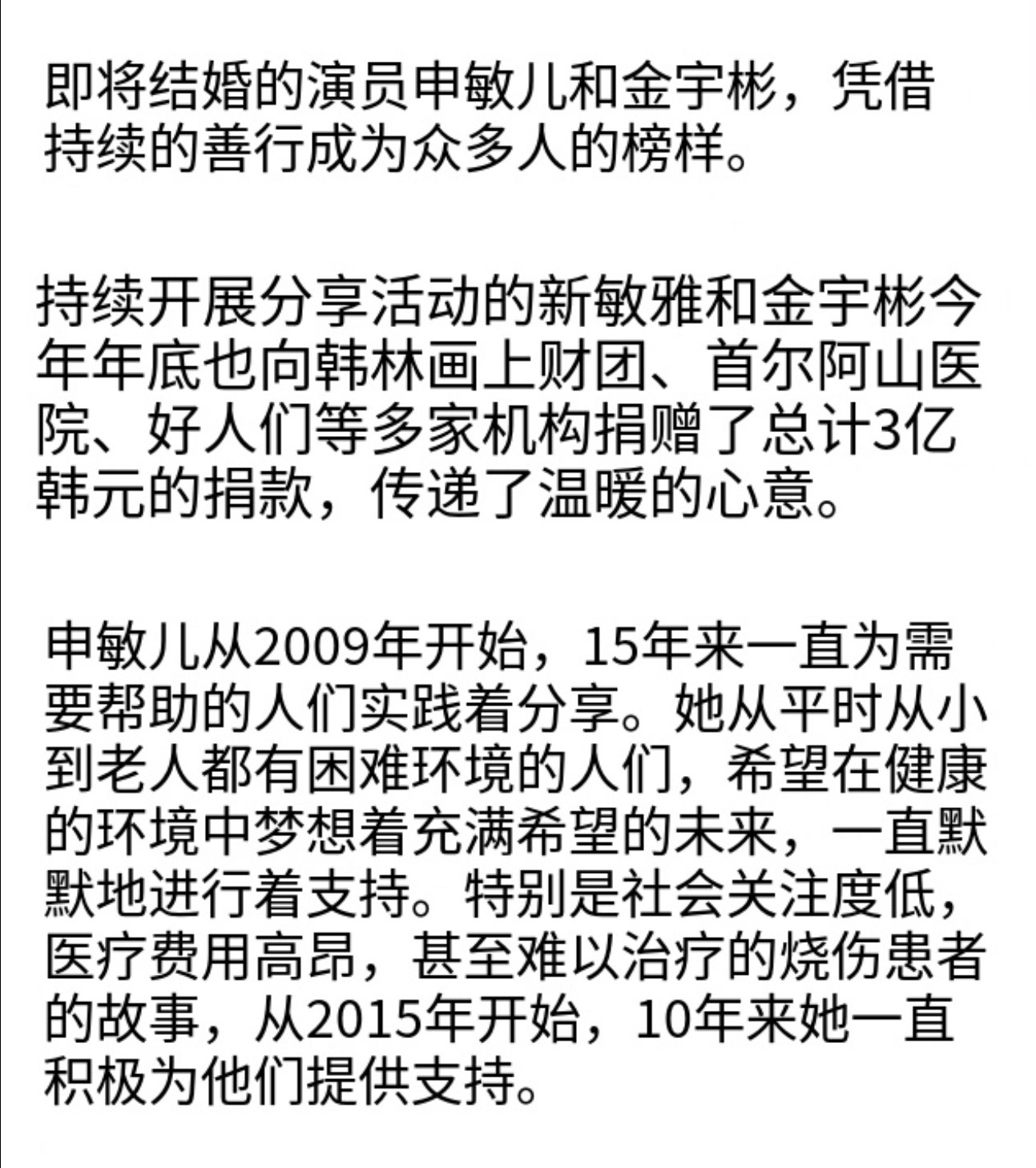 今日举办婚礼的金宇彬和申敏儿,向多家机构为社会弱势群体捐款3亿韩元。文中还写道,敏儿从09年开始的15年来,一直帮助着需要帮助的人们🥹金宇彬申敏儿向社会弱势群体捐款