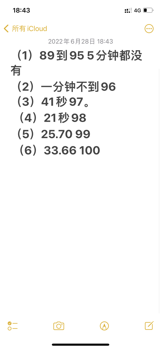 宋plusdmi110顶配慢冲很快 我今天刚去做了个慢冲两点十分到六点四十好像 22冲到89的速度很正常 然后当时有一个蚊子在我手臂上 我把他拍死拿了纸巾擦掉 这能有多久啊 就算他五分钟了 然后我就看咋九十五了 然后又一看96了我就开始记时间 这个要不要去检测电池啊 但是我后面跑hev 3.3公里就掉了四个电。 平时电池只有每天掉电百分之一 没有夸张掉电过 求解答!