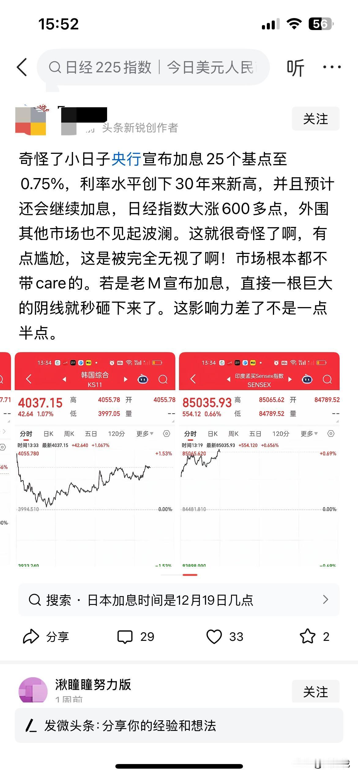 日本加息为什么昨天股市依旧大涨? 看到某财经自媒体博主很纳闷,为什么日本加息股市没有跌?全球资产没有跌?感觉挺逗。看了一下他还有几万粉丝,不得不感叹自媒体的门槛真低。 去年小编就写过美元降息周期的帖子,忽悠身边的人买贵金属和大宗商品,虽然小编自己买了后没有耐心等待,最后没赚到钱,毕竟去年我很早就建议朋友了。 那么问题来了,你不是说日本加息,怎么扯到美国了?因为影响是相互的。当然今天不扯那么远,就说一个市场的常识“买消息,卖事实”。 有点交易常识的人都知道这个,为了避免金融市场剧烈波动,西方央行在行动前就会不放风,让市场在行动前定价,信就是买消息。 等市场定价差不多的时候在行动,这个时候获利盘借机出货,也就是卖事实。 所以聪明的你马上就会想到这次日本加息已经吹风很久了,没错是这样的。年初那次市场剧烈波动其实就已经定过加息周期的价了,而吹风更是去年就开始了。所以,虽然日本央行有寡妇制造机之称,但总体没那么夸张。 那么有没有例外呢?有,瑞士央行,大家别小看瑞士央行,2015年1月那次事件经历过的人鼓励众生难忘,那次是真的血流成河……
