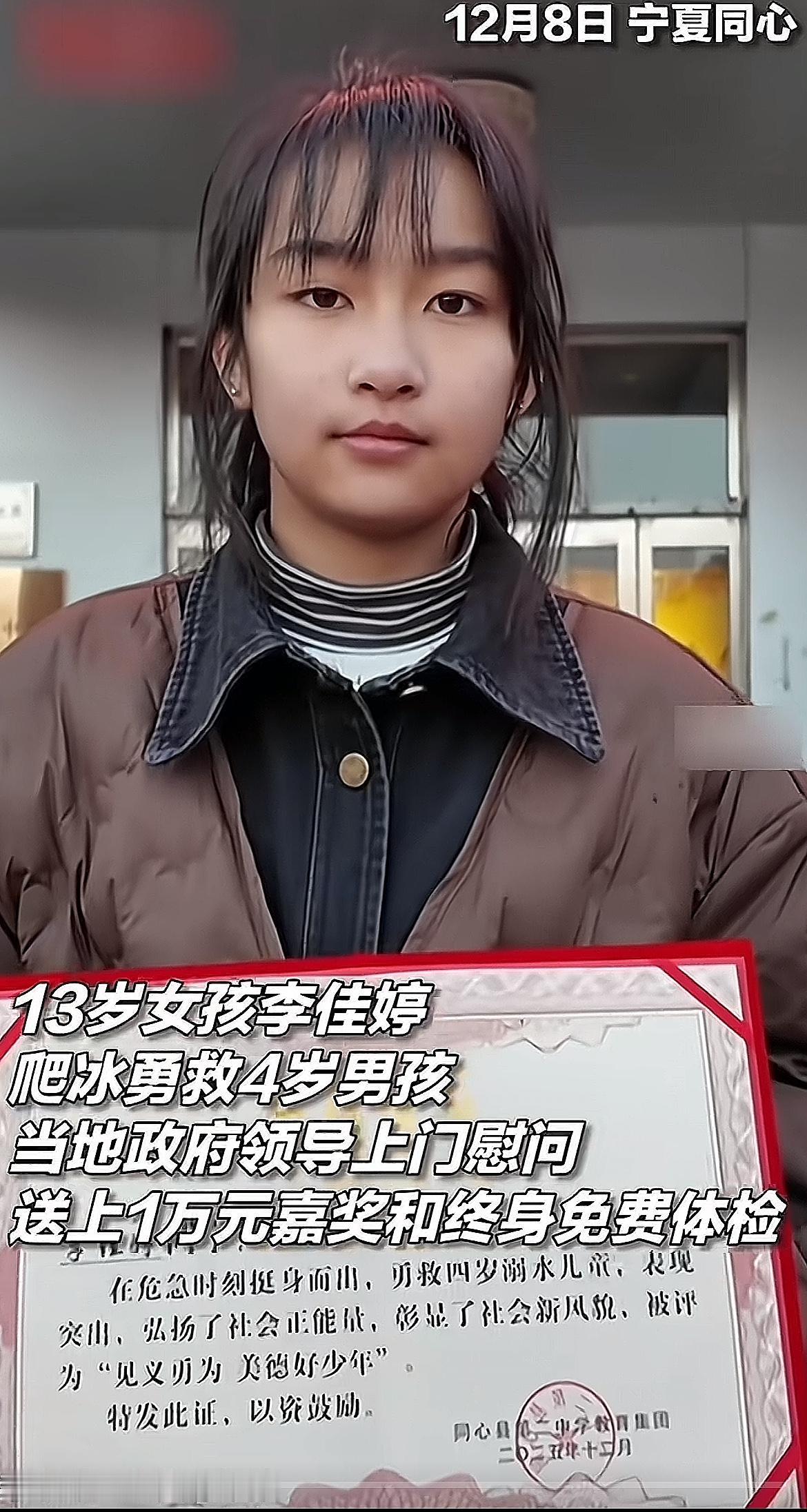 终于有定论了, 宁夏13岁女孩李佳婷救人的最新后续来了, 这下全 国人民都满意了! 为这份正义点赞!12月18号同心县的公示,不仅是对她冰面救4岁男童的认可,更让我们看到善良从不被辜负。 这个连救人后都怕父母担心、谎称被洒水车淋湿的姑娘,用稚嫩的肩膀扛起了生命的重量,这种纯粹的善举比任何光环都动人。 但要我说,表彰的意义不只是给她一个名分,更该传递“见义智为”的底线。 她用消防员教过的知识施救,事后低调离开,这才是值得孩子学的榜样。 别让过度关注打扰这个普通女孩的生活,让她在掌声里安心成长才是真呵护。 你觉得该如何平衡对小英雄的表彰和保护?来评论区聊聊你的看法~在孩子的教育上,最重要的是什么? 父母的教育和孩子的成长有关系吗?