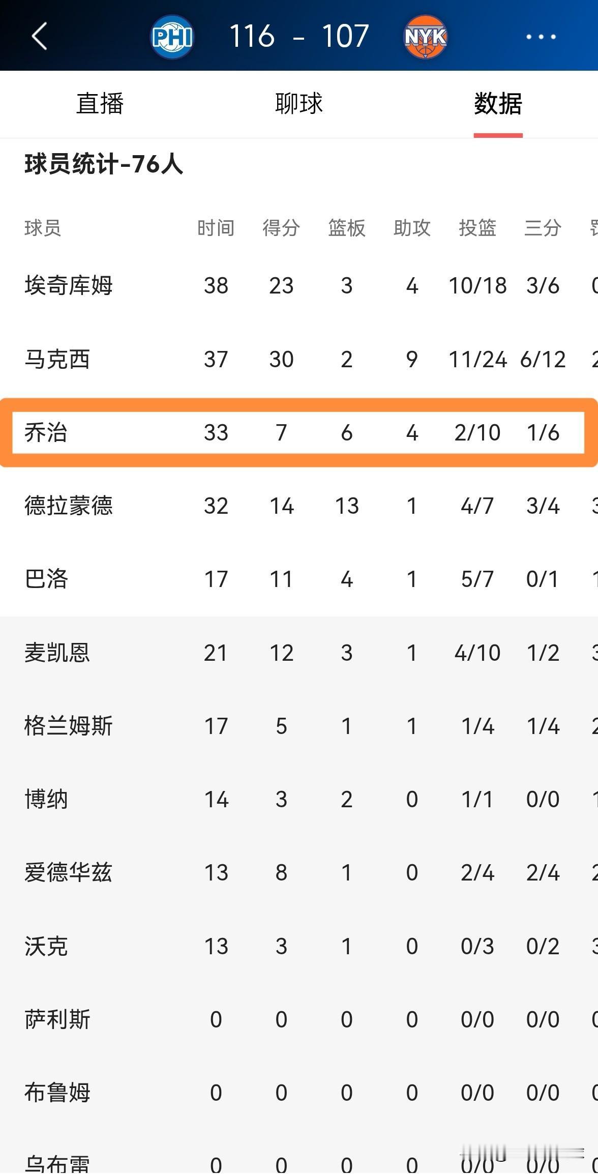 谁能拯救一下76人超级球星保罗-乔治?虽然今天76人在客场以116:107力克尼克斯,但是乔治在投篮端的表现简直糟糕透了。 全场比赛下来,乔治首发出战33分钟,投篮10中2,其中三分球6中1、罚球2中2非常低效的得到7分。 在恩比德缺阵的情况下,乔治不仅没有把握住这个大显身手的好机会,反而打得如此糟糕,真是太不应该了。