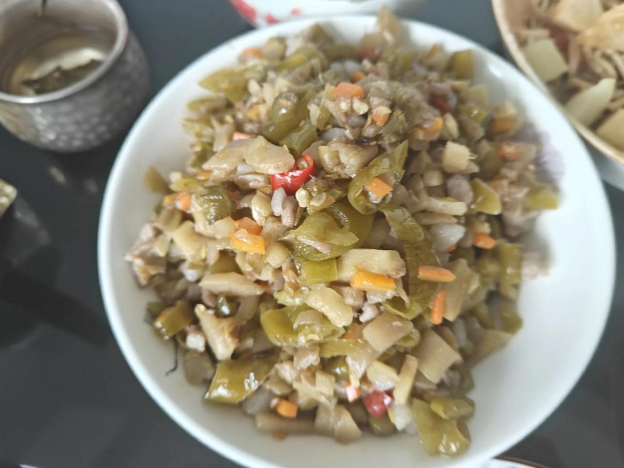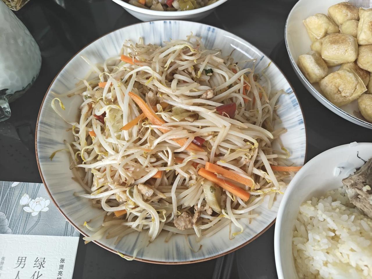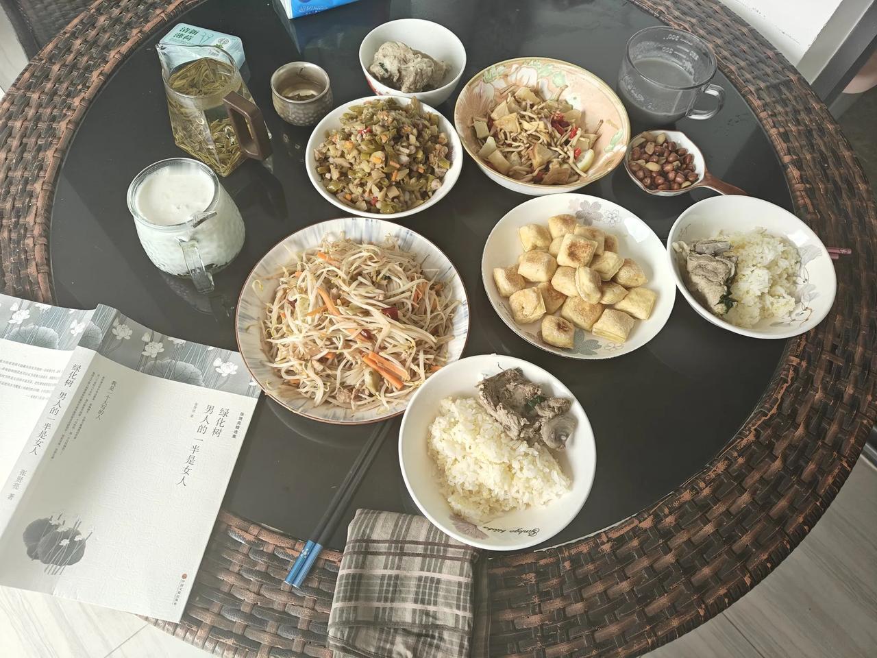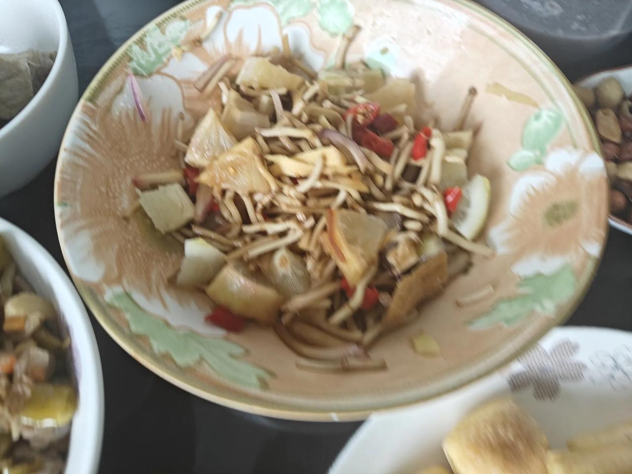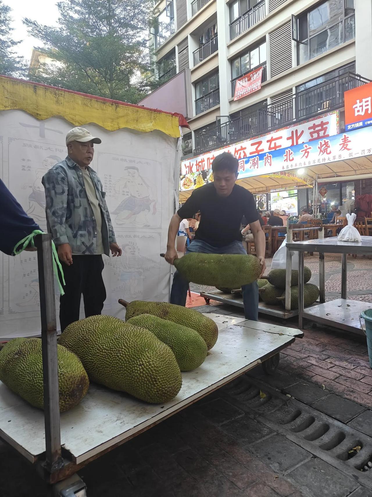 这是我们早上饭,说傣不傣说汉不汉。大概是因为汉族太多了,我这辈子很少下意识里萌生,啊!我是汉族的想法。 但是,也不是满族,更非朝鲜族,也不可能是傣族,哈尼族、拉祜族或者白族。 白族确实漂亮,不是有一个什么萍?指甲都得专人打理吗?也一直有一个问题困扰我,指甲那么长,怎么上卫生间?这个问题我是跟老战友老猫探讨的,他说,你这是杞人忧天! 我这菜应该叫傣汉合流菜,也不对。还有一碗是邻居湖南老何媳妇送过来的泡姜泡椒炒五花肉丁。 鱼腥草配小米辣,配鲜柠檬丁。大多数也享受不了,酸到倒牙。 酸度大,大概是对胃酸过多不好,但是好像是对心血管有利 炒豆芽就很普通了,1.5一大盒子能炒两回,绿豆芽是西双版纳所有菜里最便宜的了。 年轻就是好,网友诸君看看最后一张图,这是昨天晚上,在西双版纳景洪东北街上卖菠萝蜜的大侄子小峰在收摊了,抬菠萝蜜,一个50多斤。