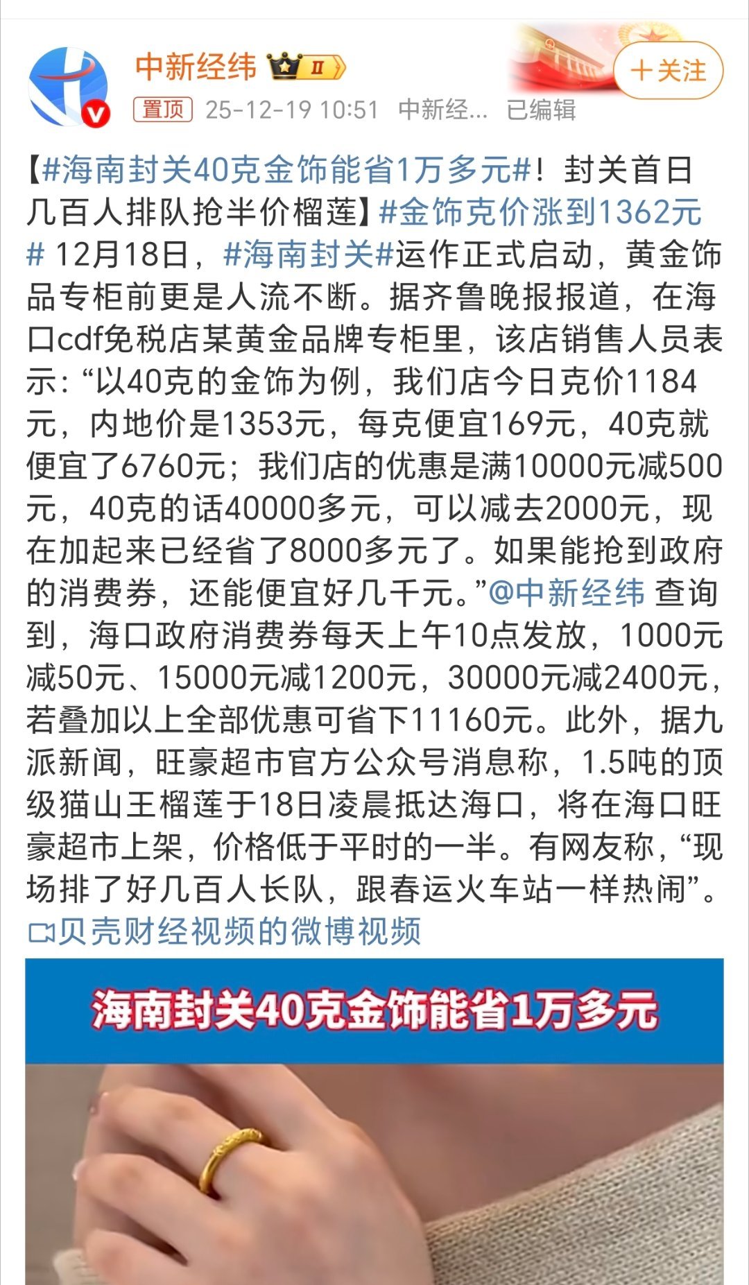海南封关40克金饰能省1万多元海南封关确实带来了很多实惠。也带火了海南游。海南民