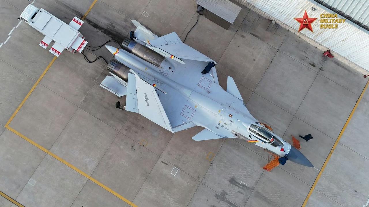 军网英文,俯拍机翼折叠状态的歼15。在进行起飞前准备!