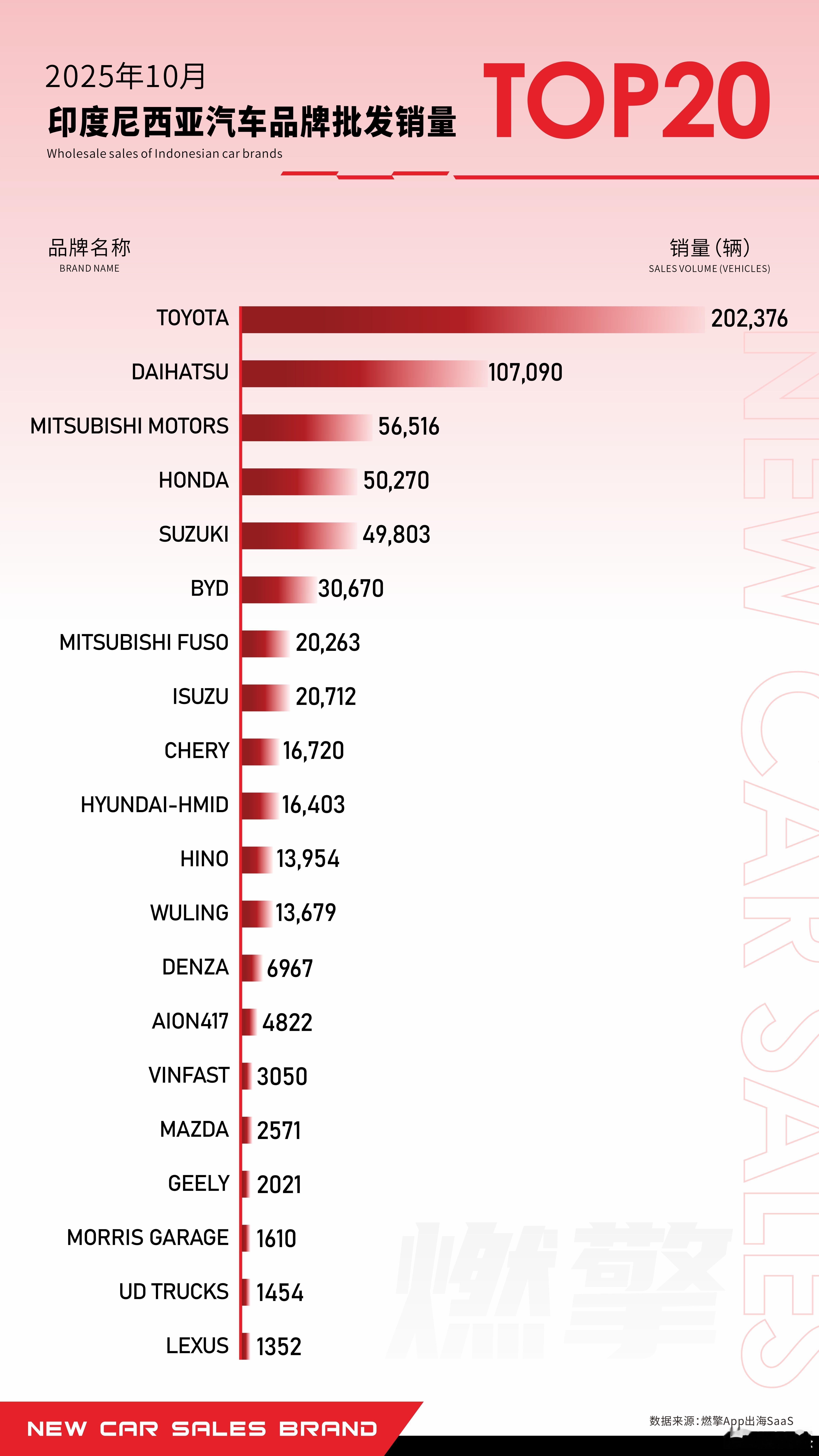 印尼汽车品牌销量T20:日系丰田领跑,华系比亚迪遥遥领先10月,印度尼西亚汽车品牌销量排名T20的榜单,清晰反映出市场由日系品牌主导、中国品牌积极渗透、商用车系稳定发展的整体格局。日系品牌在头部市场占据压倒性优势。销量前五名均为日系品牌,其中丰田以202376辆的成绩遥遥领先,销量几乎达到第二名大发107090辆的两倍。丰田凭借长期的本土化生产和对印尼市场的深度理解,构建了坚固的市场壁垒。连同三菱汽车56516辆等品牌在内,日系阵营共同占据了市场超过六成的份额,其经济耐用、口碑可靠的车型系列,牢牢抓住了最广泛的用户群体。中国品牌呈现多线发展的渗透态势,共有六个品牌上榜。比亚迪以30670辆的销量位居中国品牌之首,主要依托新能源汽车,抓住了当地新能源政策的机遇。奇瑞16720辆和五菱13679辆等品牌,则专注于满足普通家庭的经济型乘用车需求。腾势、埃安等品牌以高端新能源车型切入细分市场,吉利和名爵也凭借差异化产品初步打开了局面。以三菱FUSO 20263辆、五十铃20712辆和日野13954辆为代表的商用车品牌,销量表现稳定。它们主要对应印尼本土物流运输等商业刚性需求,是市场结构中不可或缺的组成部分。相比之下,豪华品牌如雷克萨斯,仅1352辆的销量表明其受众极为有限,难以融入以中低端消费为主的印尼主流市场。总体而言,日系品牌的主导地位在短期内依然稳固,而中国品牌通过多样化的产品布局正在稳步扩大影响力,商用车品牌则持续服务于特定的商业需求,共同构成了当前印尼汽车市场的品牌生态。大v聊车