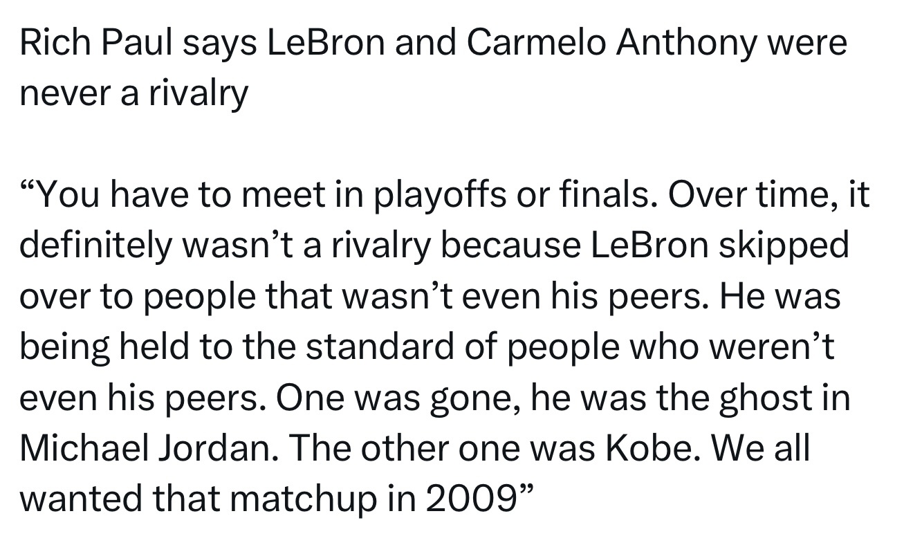 里奇保罗表示,詹姆斯安东尼从来都不算宿敌:“真正的较量必须发生在季后赛或总决赛舞台。从长期来看,这根本称不上宿敌,因为詹姆斯早已超越了同辈球员。外界总用不属于他同代人的标准衡量他——一个是早已退役的'幽灵'迈克尔·乔丹,另一个是科比。我们当年都期待着2009年能看到23vs24的对决。”