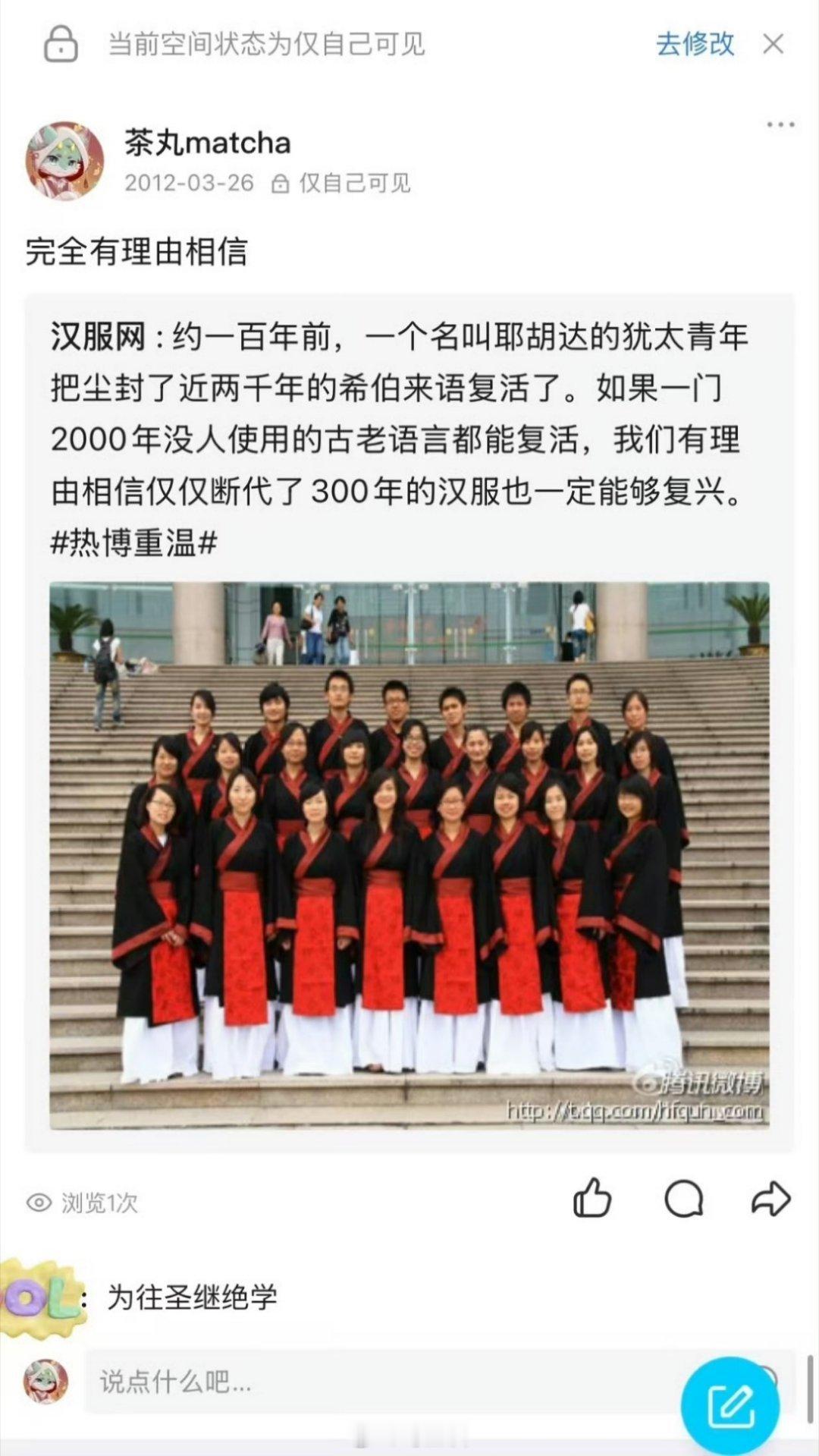历史上汉服复兴曾被打断数次,有战争、有舆论。事实上在十几年前汉服复兴都是一件不可想象的事。据我了解,汉服能有如今之局面,大部分功劳要归于90后、00后。为什么这一次能得到各族同胞的支持?因为这本来就应有寻常之事,正常人都喜闻乐见,却被某些阴谋家扣了太多帽子。