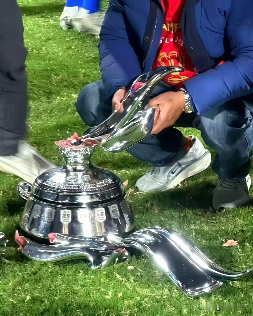 看到网上的照片才知道,吴川青年队获得省超联赛冠军,在颁奖后球员们热烈庆祝时候,好好的冠军奖杯竟然破碎了!这也太不可思议吧?! 不管在庆祝的时候球员们的动作有多大,也不至于破碎成这样吧?又不是纸糊的,也不是陶瓷做的,怎么至于碎成这样呢!?怪就怪是奖杯的质量问题吧。当然,碎了也没事,反正2025年广东省足球超级联赛的冠军就是吴川青年队!这个荣誉永远铭刻在史册上!