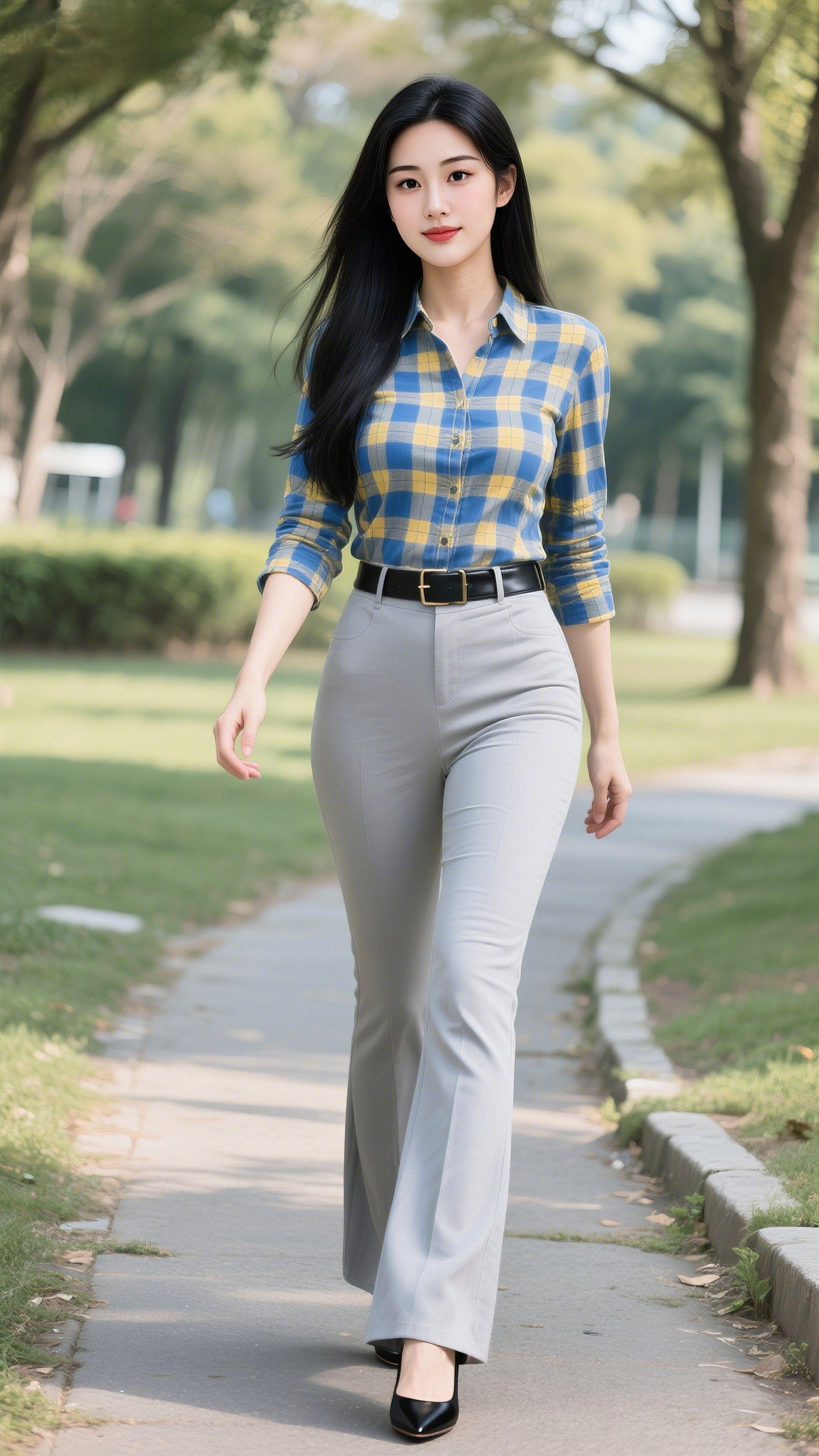 格子衫配微喇裤,通勤穿搭的松弛感拿捏了