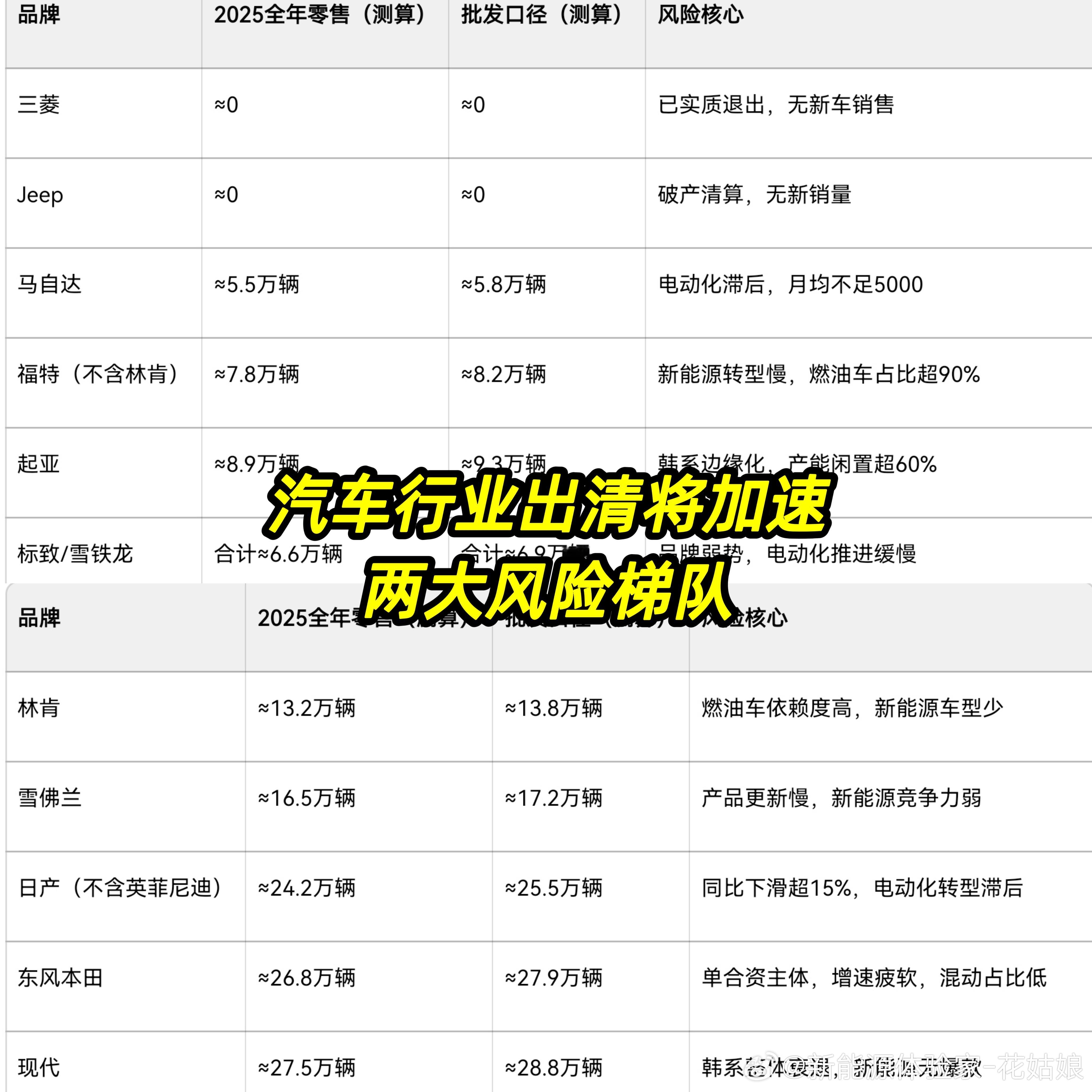 中国电动汽车百人会理事长张永伟:2026年车市2%微增长,行业出清将加速。年销量不足10万辆的跨国车企,退出中国市场的概率超80%,预计将有5—6家;年销量10万—30万辆的跨国车企有4—5家,退出概率为50%—80%。按2025年1-11月在华销量(乘联会等公开数据口径,含合资),以下是接近张永伟所述销量区间的跨国车企清单,明确划分为两大风险梯队。一、年销不足10万辆(退出概率超80%),附图二、年销10万—30万辆(退出概率50%—80%),附图三、最可能先退出的3家(按退出优先级)1. 三菱:已无实际销量,退出进程已完成,概率100%2. Jeep:破产清算状态,无复产计划,退出概率100%3. 马自达:销量持续低迷,电动化转型无明确有效动作,退出概率90%+ 大v聊车 新能源大牛说 新能源汽车