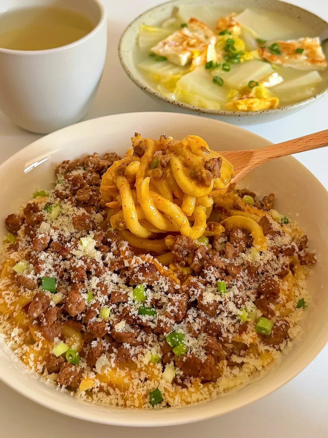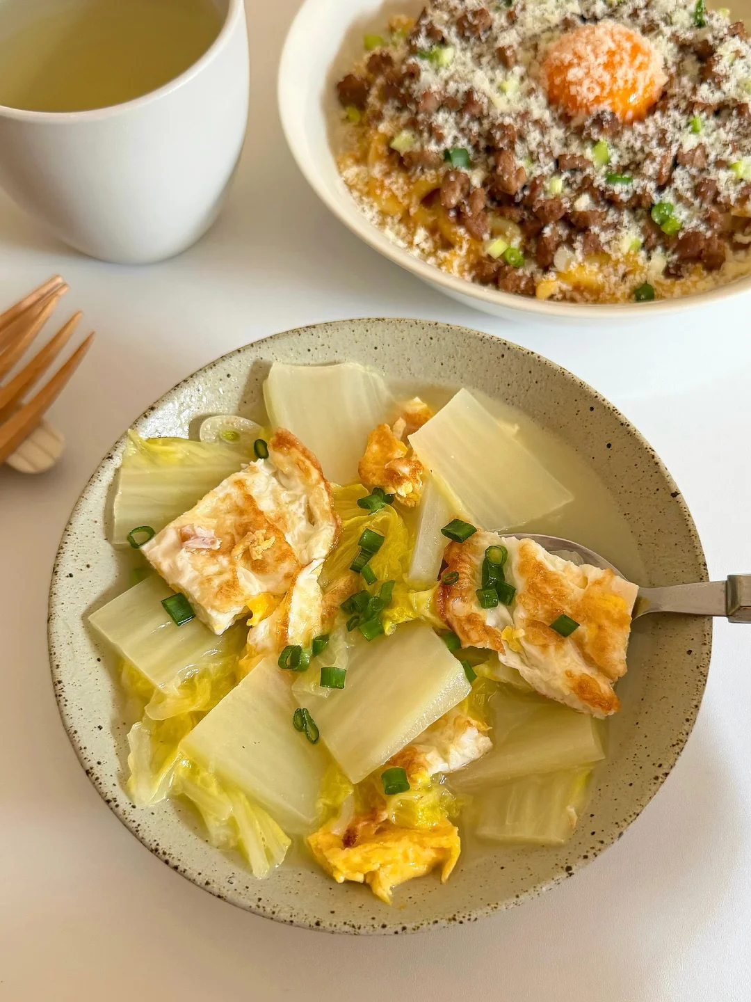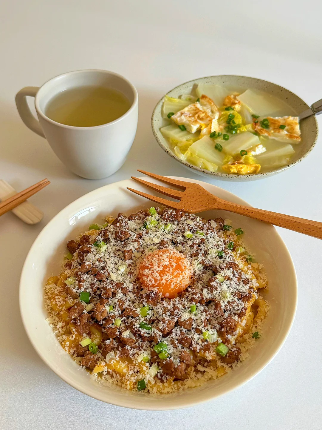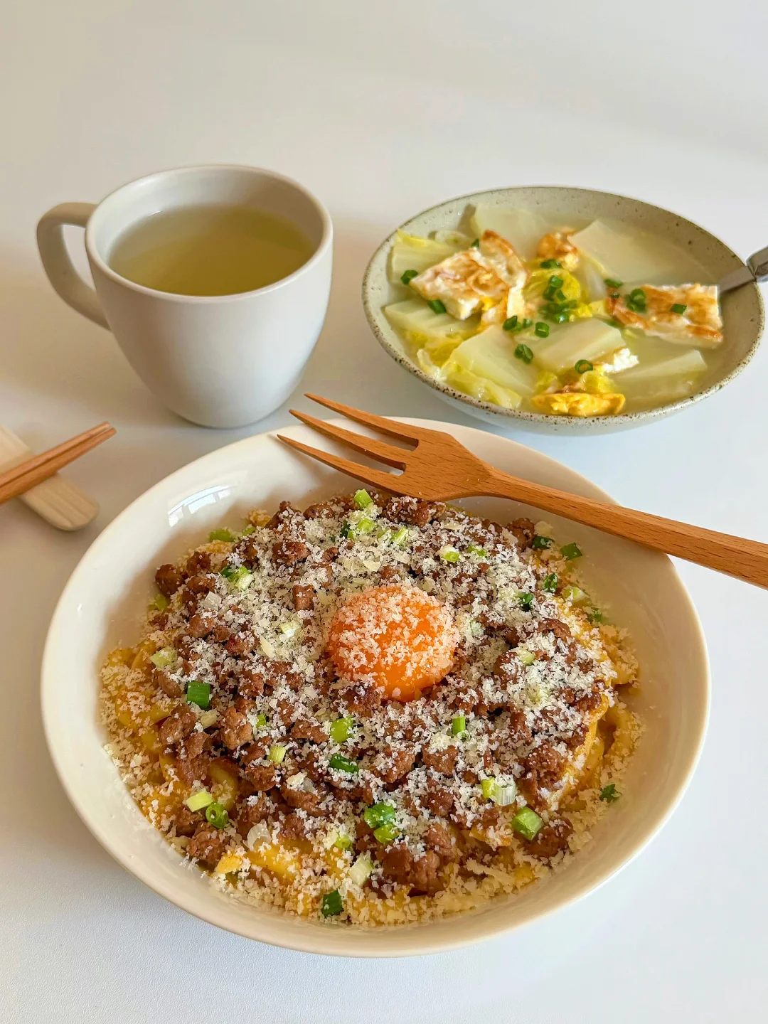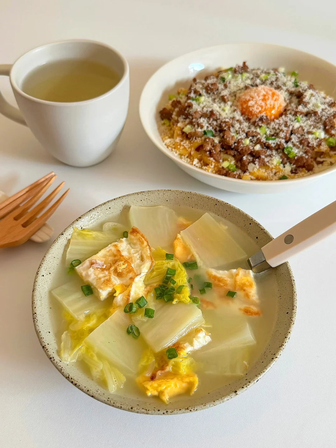 这样吃真的好舒服!! 辣咖喱奶油牛肉乌冬面+白菜煎蛋汤+热姜茶🍵 有肉有汤有主食~营养美味! 干净健康,but有滋有味! 吃完好满足! . 喜欢这样简单快乐的生活! . 🍜 所需食材:乌冬面、牛肉、洋葱、可生食鸡蛋、辣咖喱/纯牛奶/葱姜、白菜 (用纯牛奶代替淡奶油) 具体做法在图6和9~ 期待各位的分享!