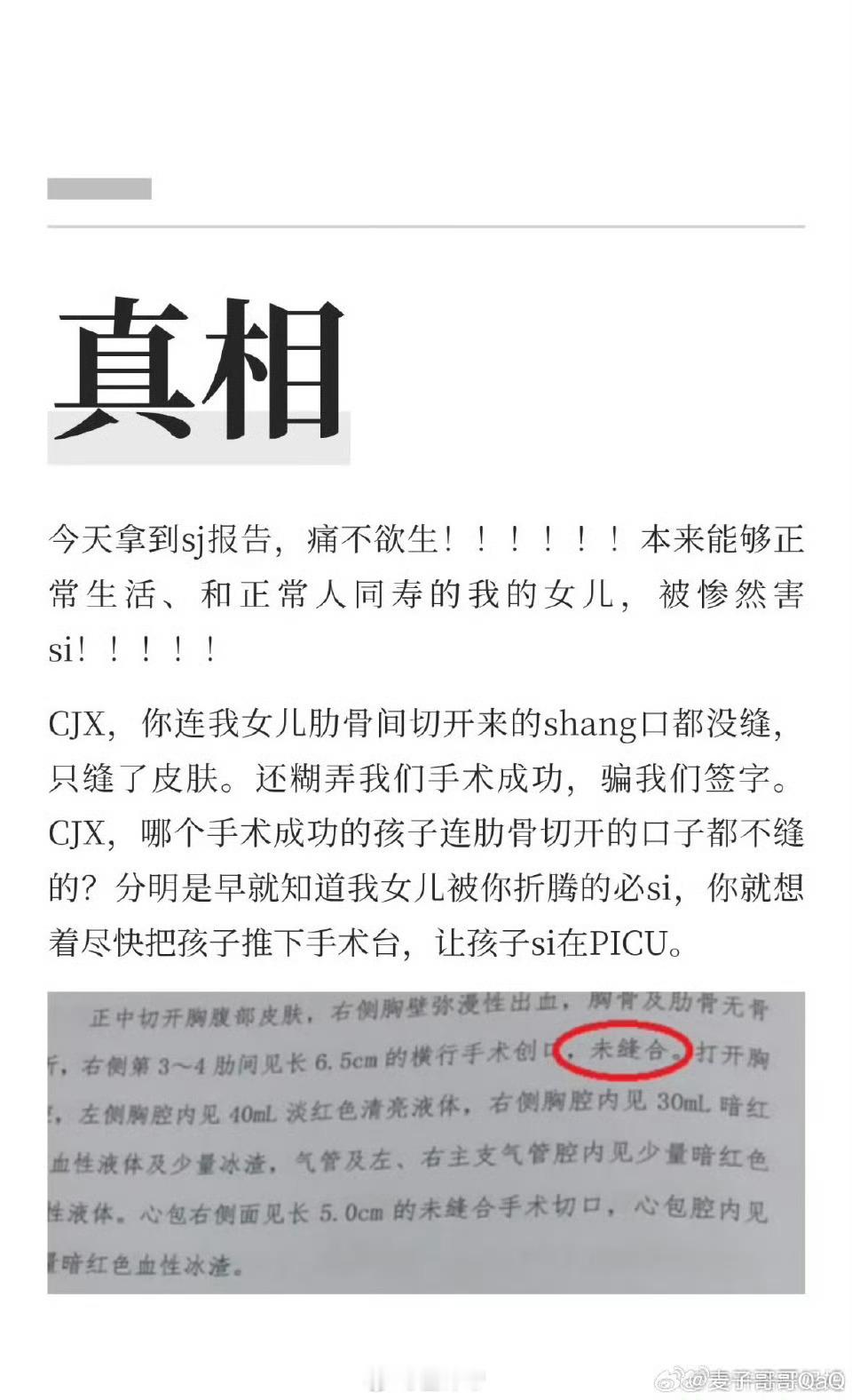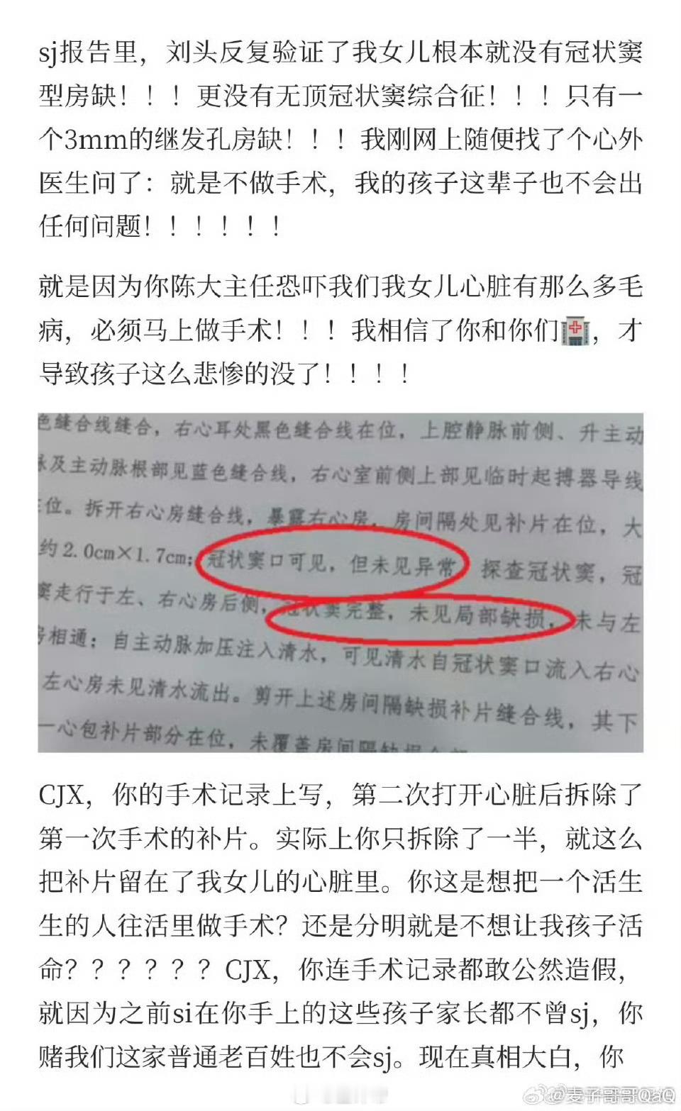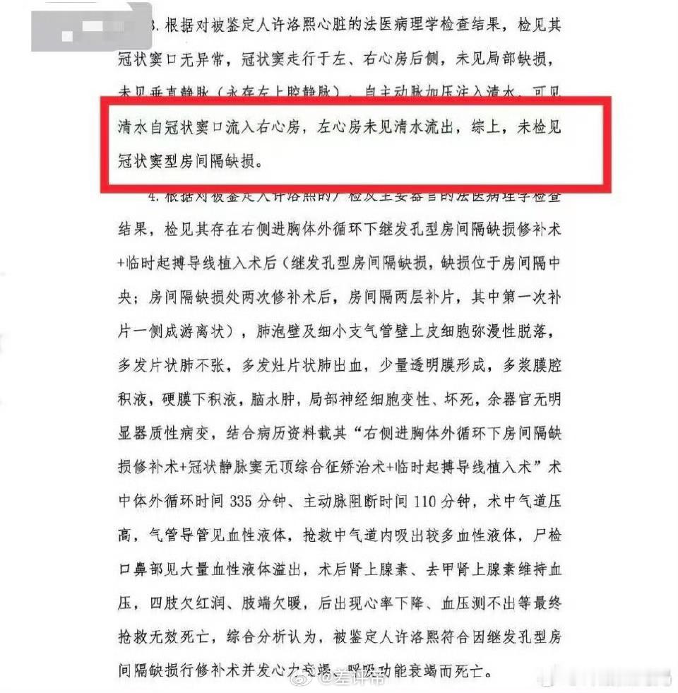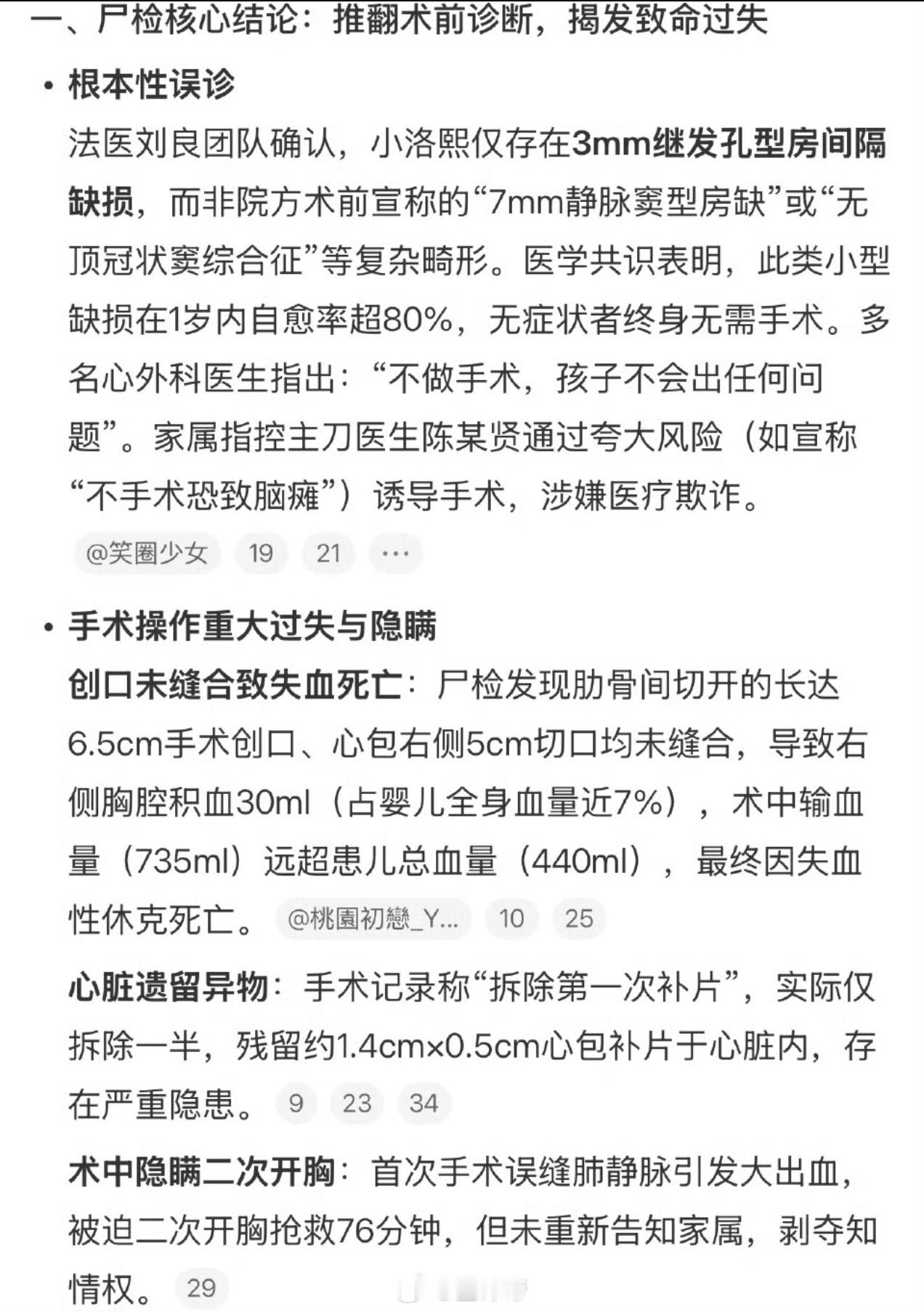 韩红为小洛熙宝宝发声整个人看麻了!法医刘良做的尸检报告的主要有以下几点:1,没有术前所说的7mm房缺,只有一个3mm可以自愈的继发孔房缺2,没有冠状窦型房缺 没有无顶冠状窦综合征。 3,肋骨间切开的长达6.5cm创口未缝合。4,心包右侧5cm手术创口未缝合。5,心包补片只拆除一半,另一半留在心脏里,留下1cm×0.9cm的未闭合缺损。太让人心痛了!