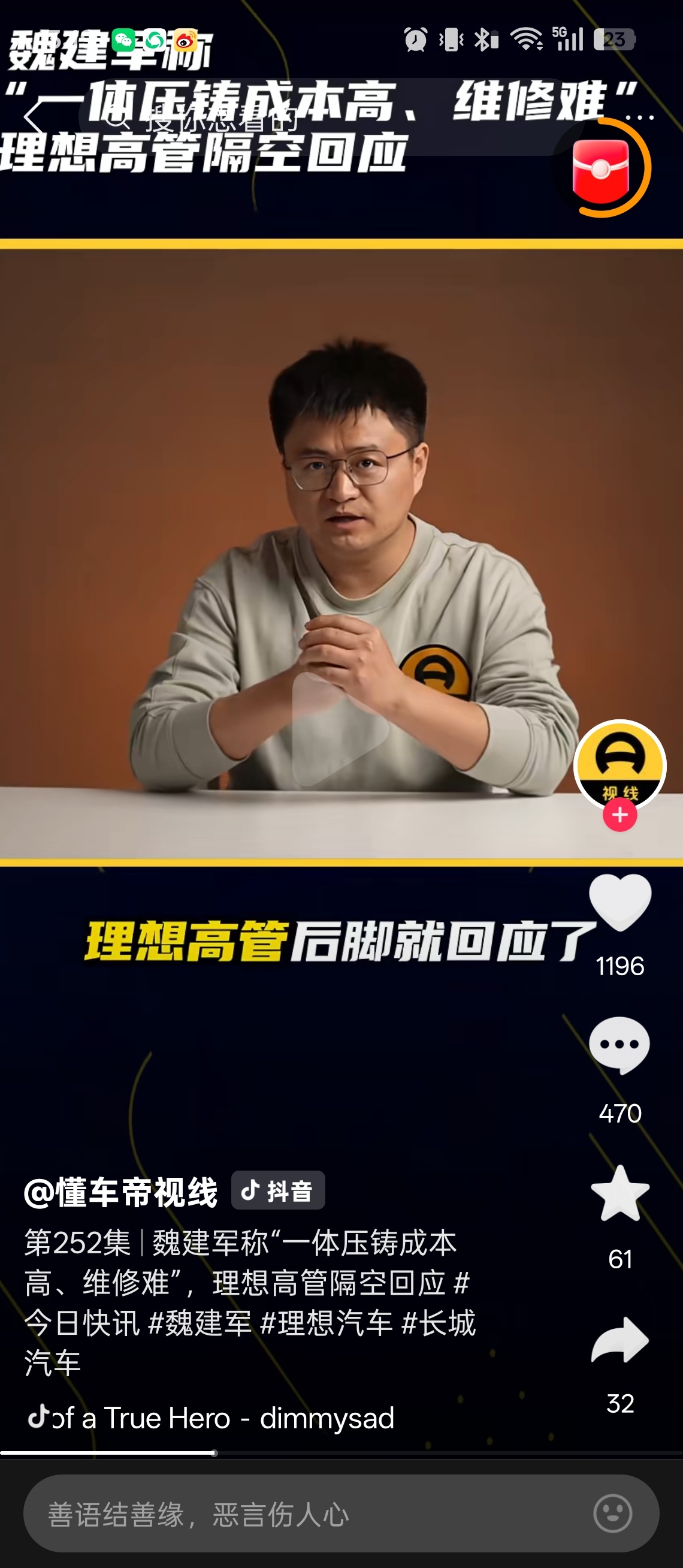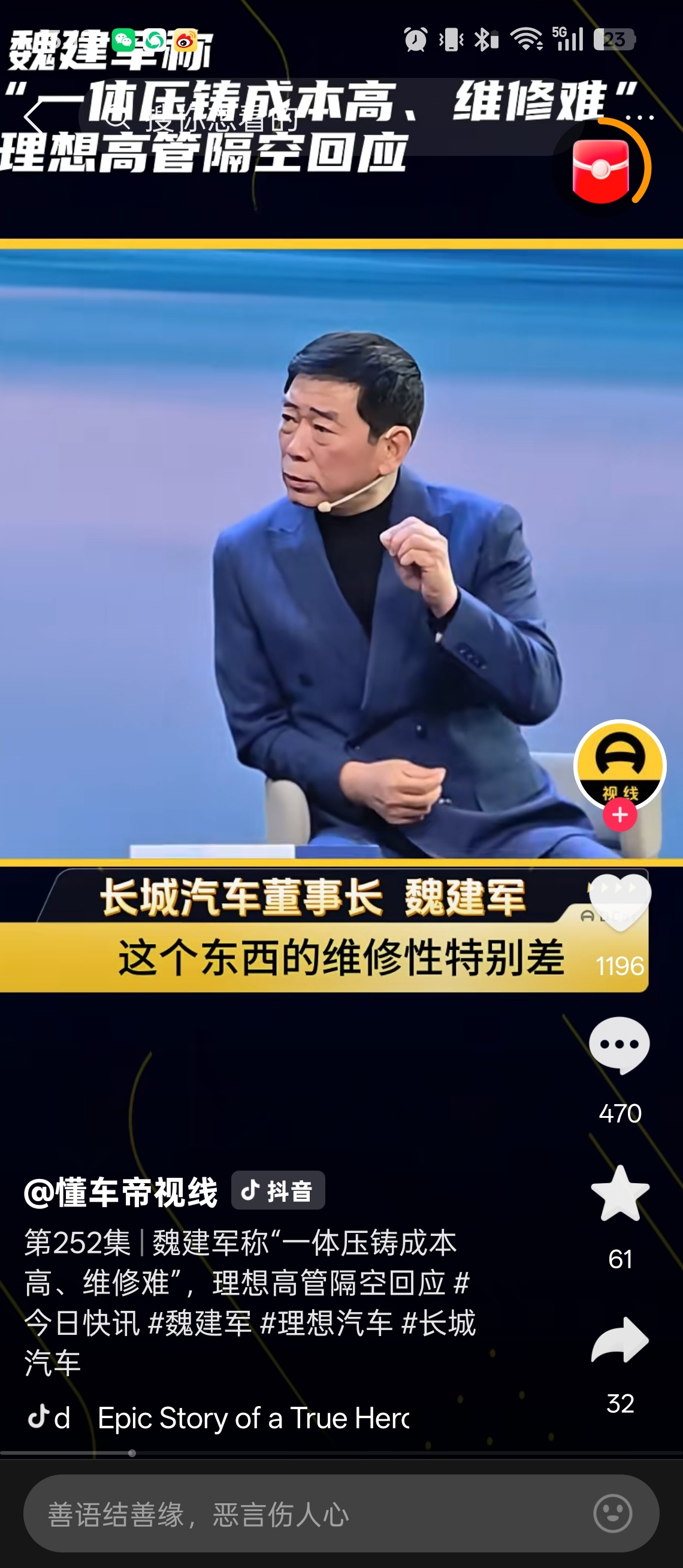 据我所知,只是刚好最近理想材料日,回答了用户关于「一体压铸,维修经济性」的问题。压根不知道,也没想说“怼长城的魏总”,是媒体赶鸭子上架,搞成了对立。他自己也一脸懵逼