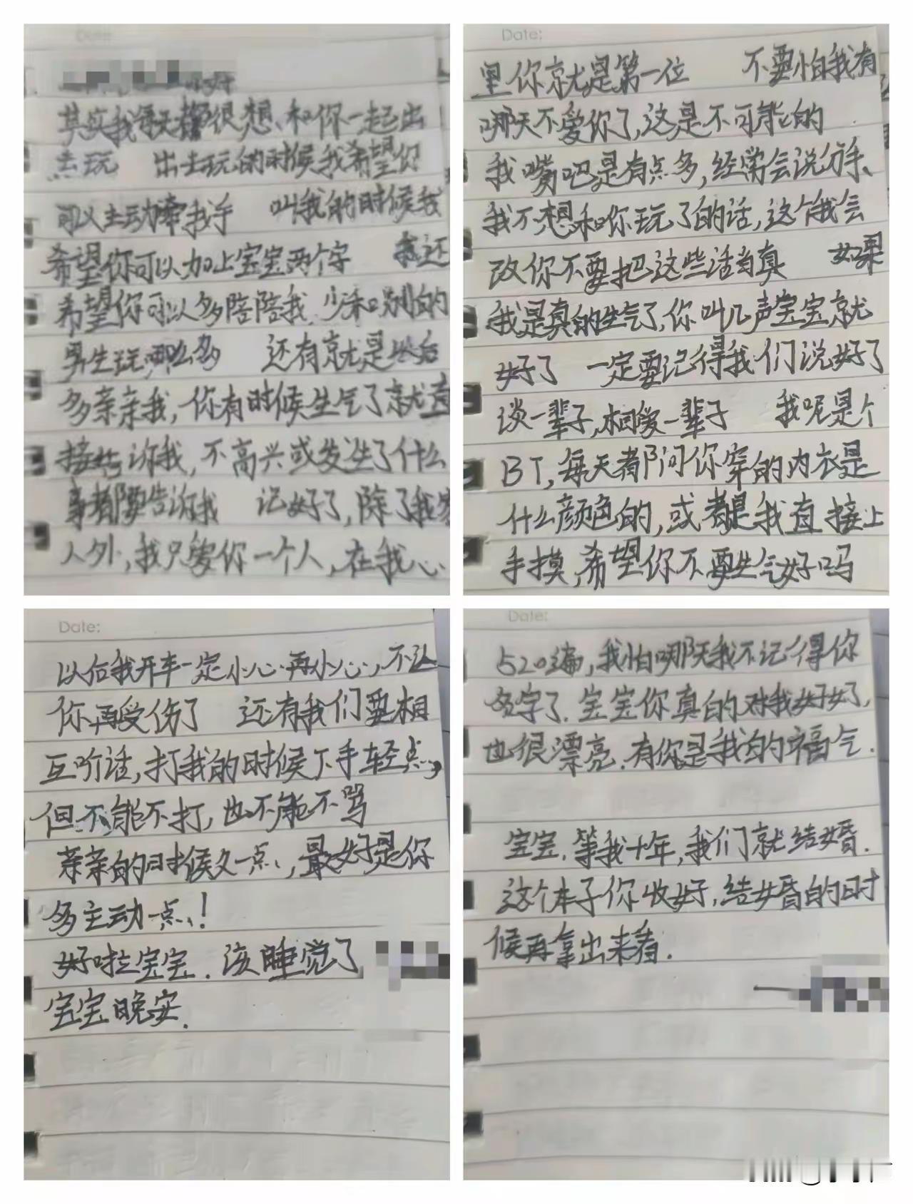 12岁的男孩子给女生写了这样的情书,真是让人挺意外的! 说彼此怎样喜欢, 说到未来怎样生活都无可厚非,这是他们青春萌动的表现,也是他们对未来的期许是一份美好。 但是这个男孩子说想象的女孩穿什么 颜色的内衣,甚至只想去摸一下, 这一点有些过分了! 看起来无论家长还是老师对青春期孩子的性教育真的要正面引导, 避免孩子走向误区,不能自拔,做了不应该做的事儿, 这样既伤害了别人,又伤害到了自己, 一定要注意观察,孩子青春期思想心理的变化及时的进行正确的性教育, 让孩子知道这个过程是每个人都有的是正常的,发育阶段自己不要恐慌,也不要觉得是羞愧,但是自己要有对错判别能力, 要知道什么该做什么不该做,尤其男孩子,对于异性的女孩子,不能够超越底线,否则自己就做了错事,甚至是影响自己前程的事 无论是成人还是青少年时期,每个人要做到自我控制力, 每个人要积极向上向善, 不能做违背道德的事,也不能做伤害他人的事,这样会损人不利己!告诉孩子, 无论男生女生要学会自我调控自己的情绪和行为,不能因为 为所欲为,因为这是人与动物的最本质的区别!