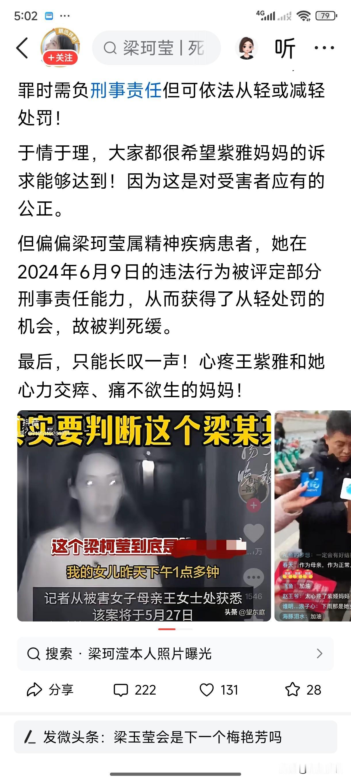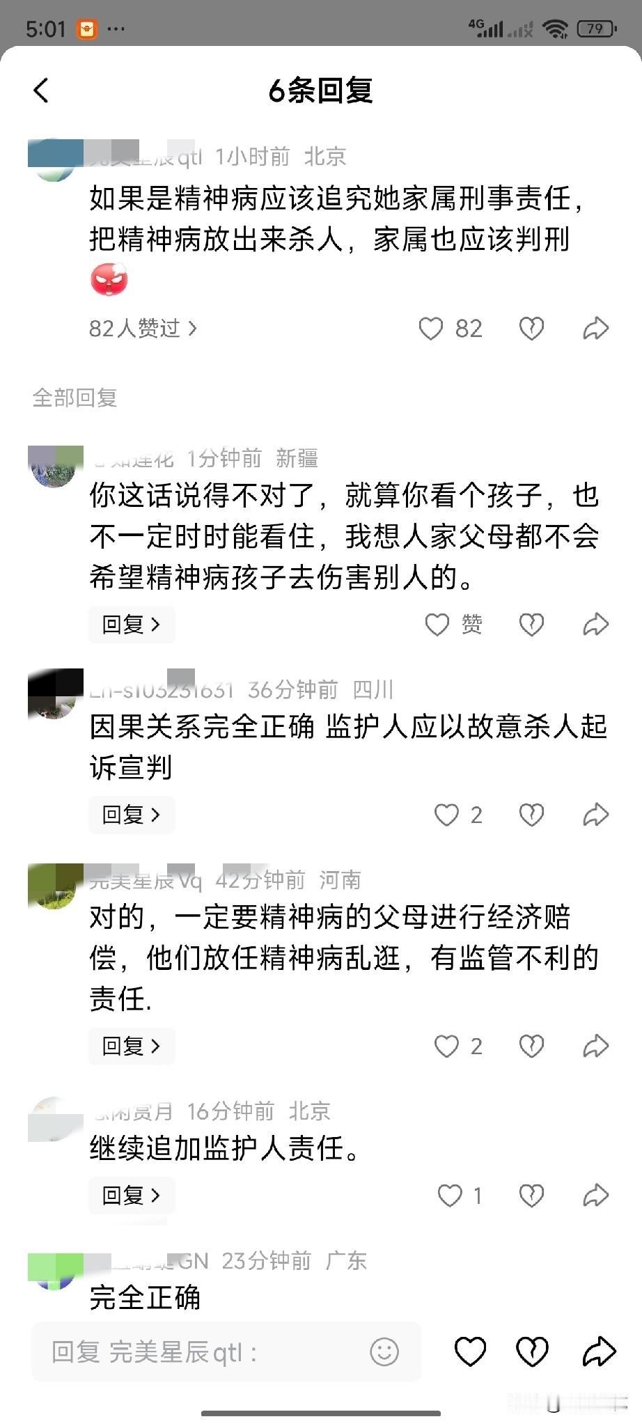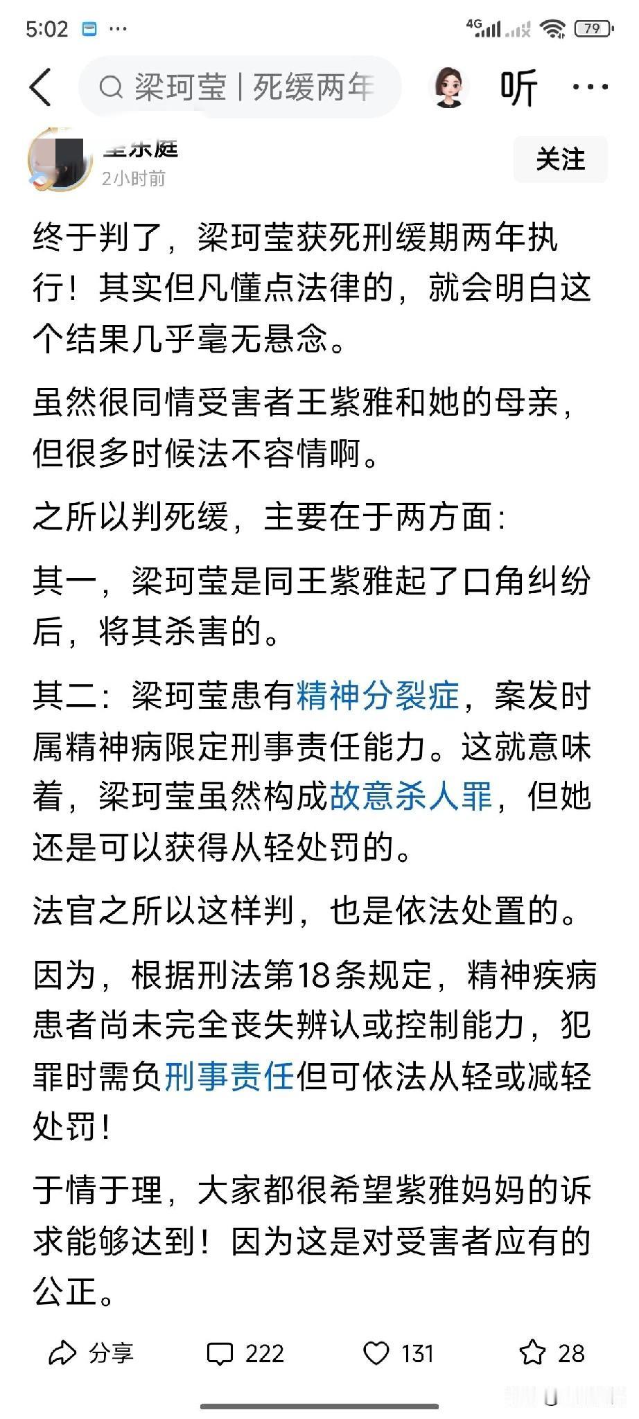 精神病人故意杀人!其家属(监护人)也应该追究刑事责任吗?应该以故意杀人起诉吗? 王紫雅被害案今日判了,凶手梁珂莹因患有精神分裂症,获死刑缓期两年执行! 这个判决虽然没有达到紫雅妈妈的诉求,但法官的判决也是依法公正的。 网友们对凶手的气愤我可以理解,但是有网友提出应该追究精神病家属的刑事责任,甚至有网友提出以故意杀人起诉精神病家属。 这一点我表示很反感,精神病人就像老年痴呆的老人一样,专人看,也不一定时时能看得住,经常有老年痴呆的老人走失,我想精神病人的家属,他们也不希望发生这样的事,大家不能以此来泄愤。 不过,像这种精神病人应该及时送医,不然对家人和外人都是一种潜在威胁。 这也提醒我们,平时远离精神病人,更不要跟这种人纠缠理论。 晒图笔记大赛紫雅案 王紫雅案
