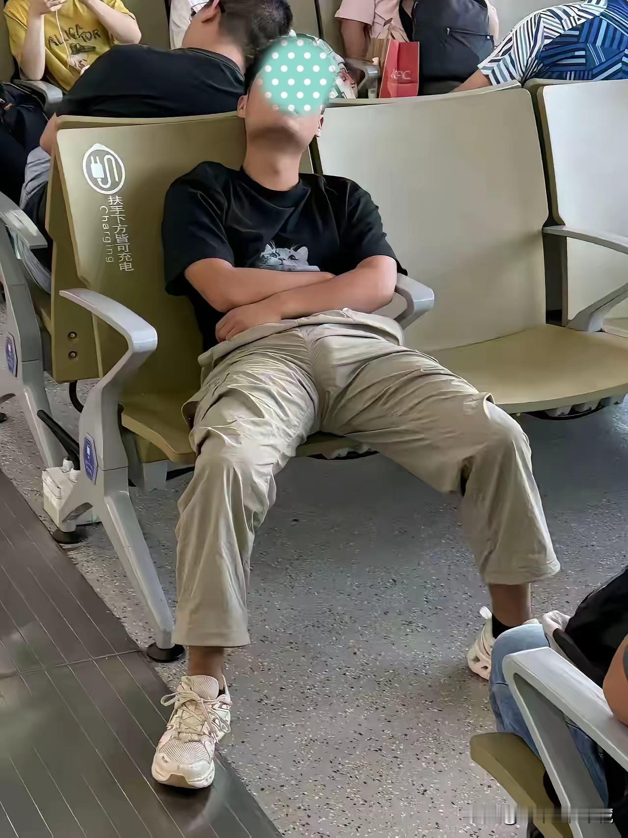 一帅小哥在火车站大厅座椅上休息,看来是在外打工太久了,他也太累了,坐在那里就睡着了,可能太过想念家中老婆,想到马上就要回到家中和老婆团聚自然高兴,俗话说,小别胜新婚,小伙梦到自己老婆了吧!