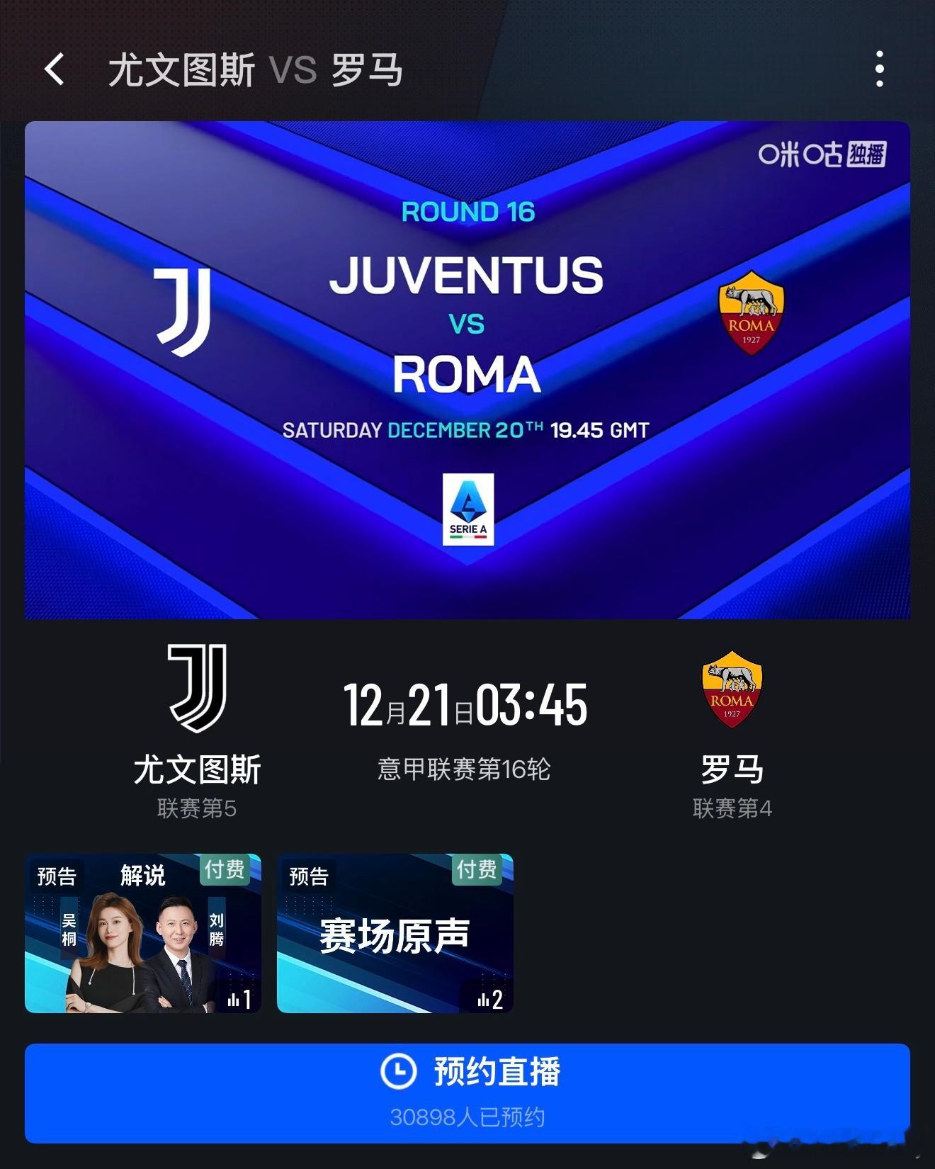 解说预告🎙️周六27:15尤文图斯vs罗马,搭档刘腾周日24:00阿斯顿维拉vs曼联,搭档徐指,主持思思周一24:00沙迦vs利雅得新月,单口ps:布雷默可能会进入首发,加公也倾向于派出迪巴拉。今晚皮耶罗将在现场观看本场比赛!尤文图斯vs罗马阿斯顿维拉vs曼联桐话绿茵