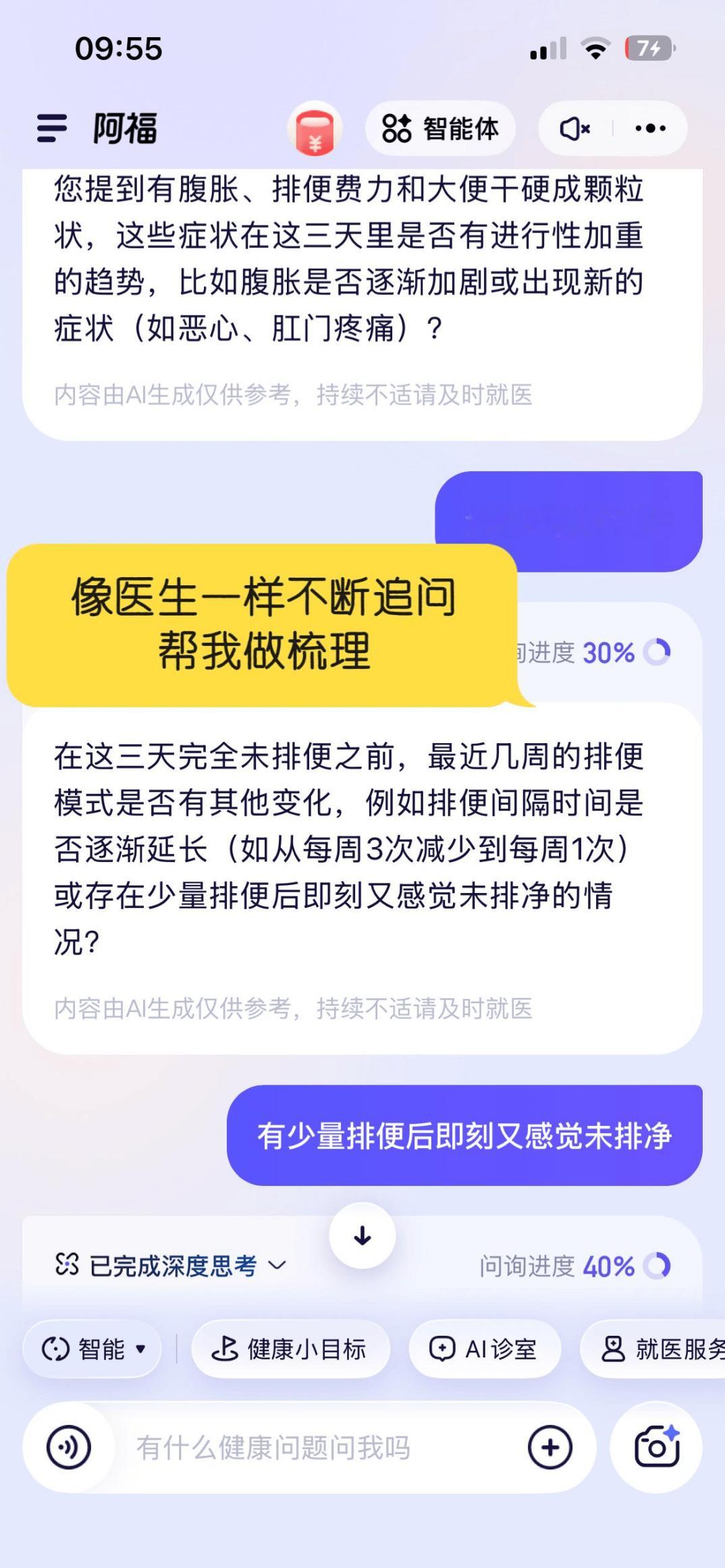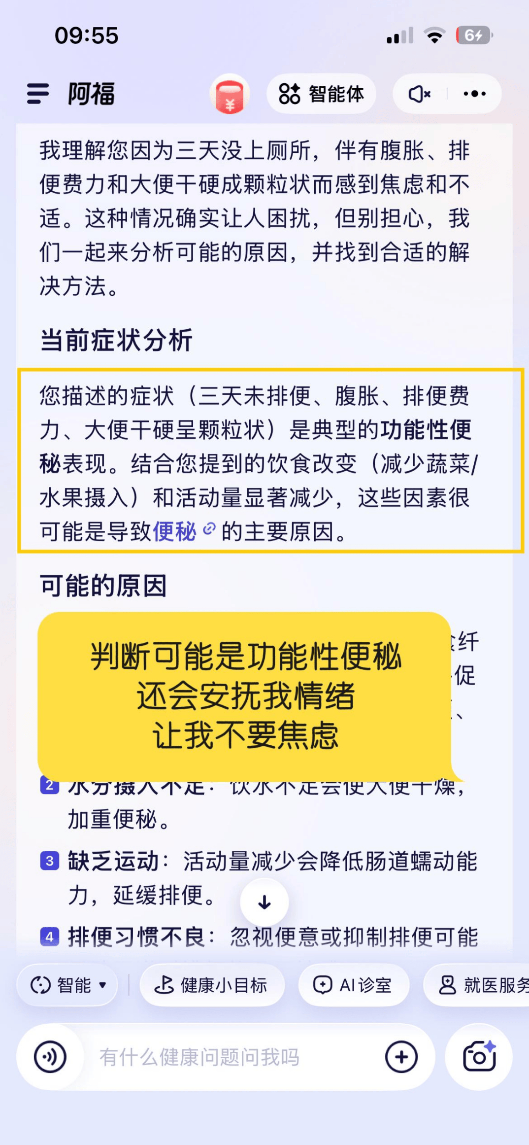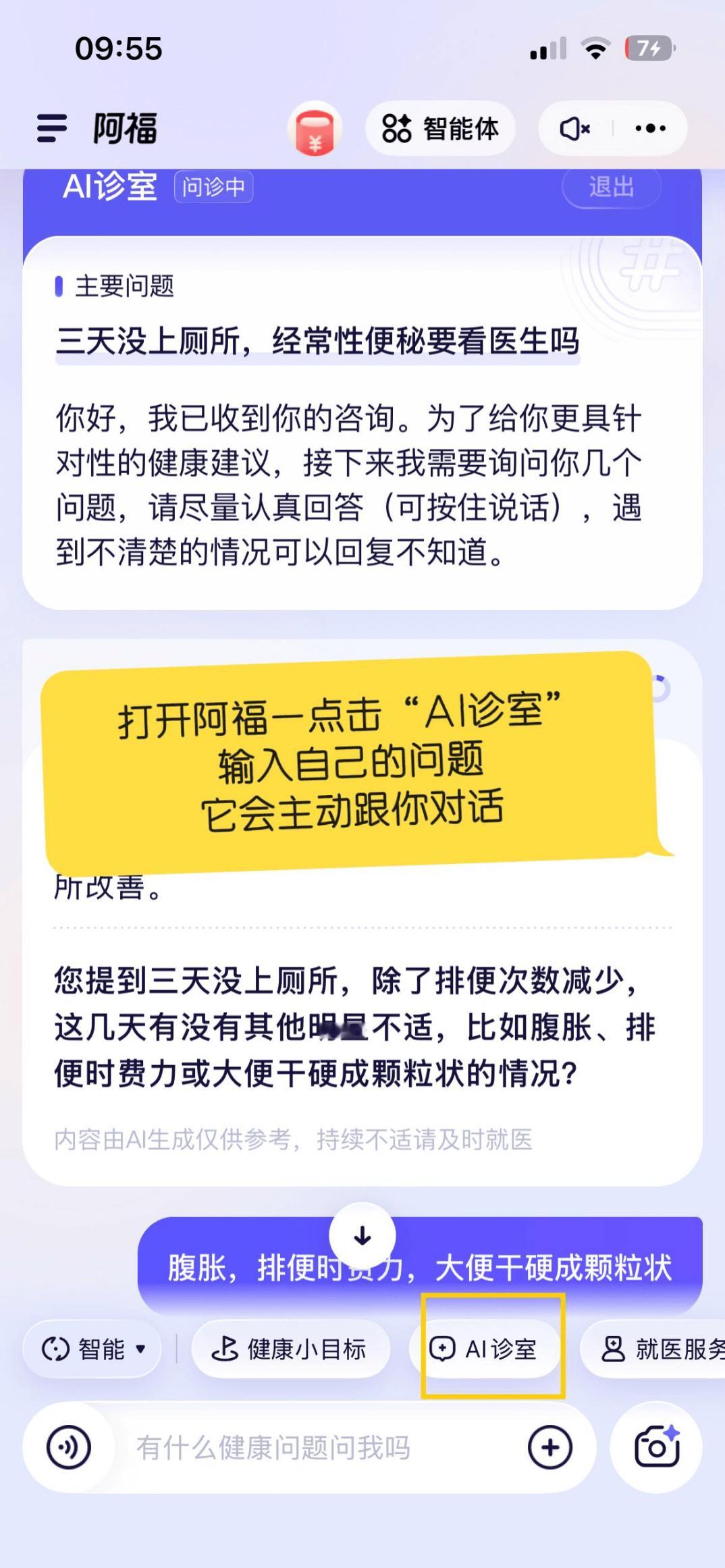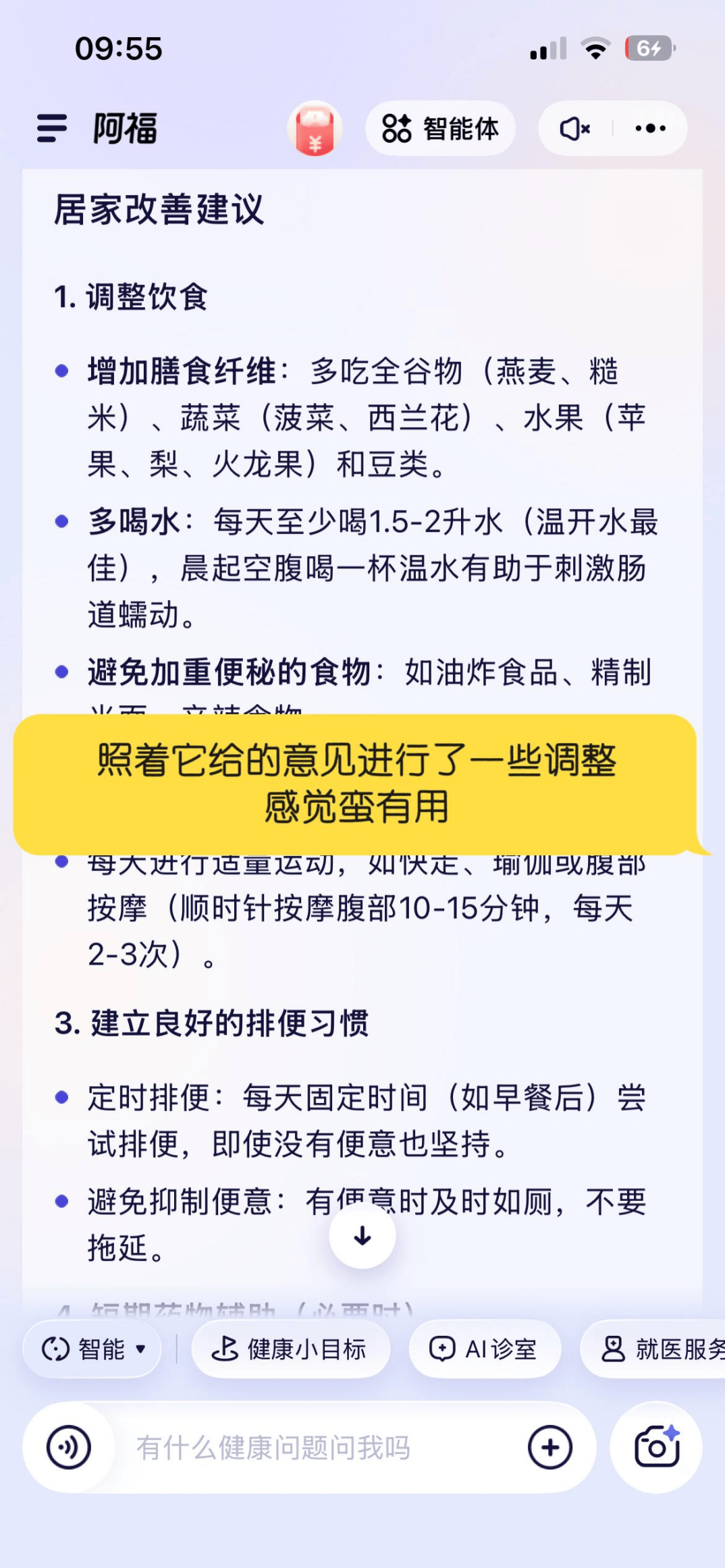AI医生请回答今天跟大家说点屎尿屁的问题,便秘拉不出怎么解决很多人跟我又一样的困扰把,上次我便秘了整整三天!!吃蔬菜水果也不顶用。教大家一个小技巧,去问蚂蚁阿福,每个人情况都不太一样。给的也不是通用答案,会一点点追问细节戳此下载蚂蚁阿福比如他问我"大便干硬吗?"”拉的时候会不会痛“”“最近饮水、运动有变化吗?”我跟医生聊这个可能会尴尬,但阿福我随意。最后基于我的回答,阿福分析可能是功能性便秘。给我的建议是:晨起一杯温水、尝试腹部按摩、优先补充可溶性膳食纤维(如燕麦、火龙果)。如果情况持续不缓解,建议我一定要去看医生。我试着照着做了几天,多亏有阿福!我也是拉了