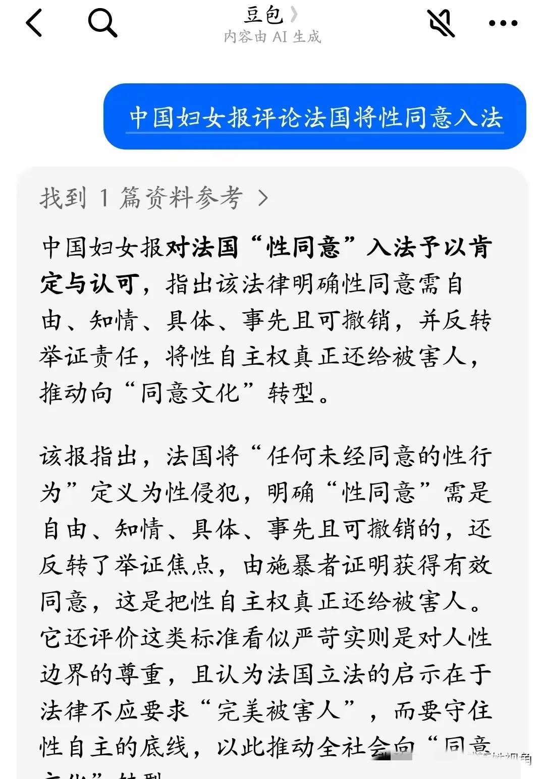 法国“性同意”入法这波硬核操作!直接把“性同意”写进法条,给女性权益上了层铁护盾!《中国妇女报》更是连夜扒细节划重点,生怕姐妹们看不懂里面的门道! 法国这“性同意”标准贼明确——可不是猜来猜去的玄学,必须是清清楚楚的“我愿意”!沉默不等于同意,就算之前点过头,后面也能随时喊停!这法律就是硬气喊话:别拿“没反对”当借口,更别拿“以前同意过”当挡箭牌! 《中国妇女报》掰开揉碎讲得透彻:同意没有模糊地带!喝醉说“不”算数,被威胁说“行”不算数,约会反悔也能理直气壮拒绝——法律就是最硬的底气! 有人说小题大做?可现实里多少伤害就藏在那模糊边界里!法国这波就是把“模糊”变“清晰”,让每个“不”都掷地有声! 最后说句实在的:法律是底线,尊重才是根本!《中国妇女报》为啥反复解读?就是想让姑娘们都知道——你的身体你说了算,你的同意必须被尊重!这可不是小题大做,是把女性权益的大事,做得明明白白!