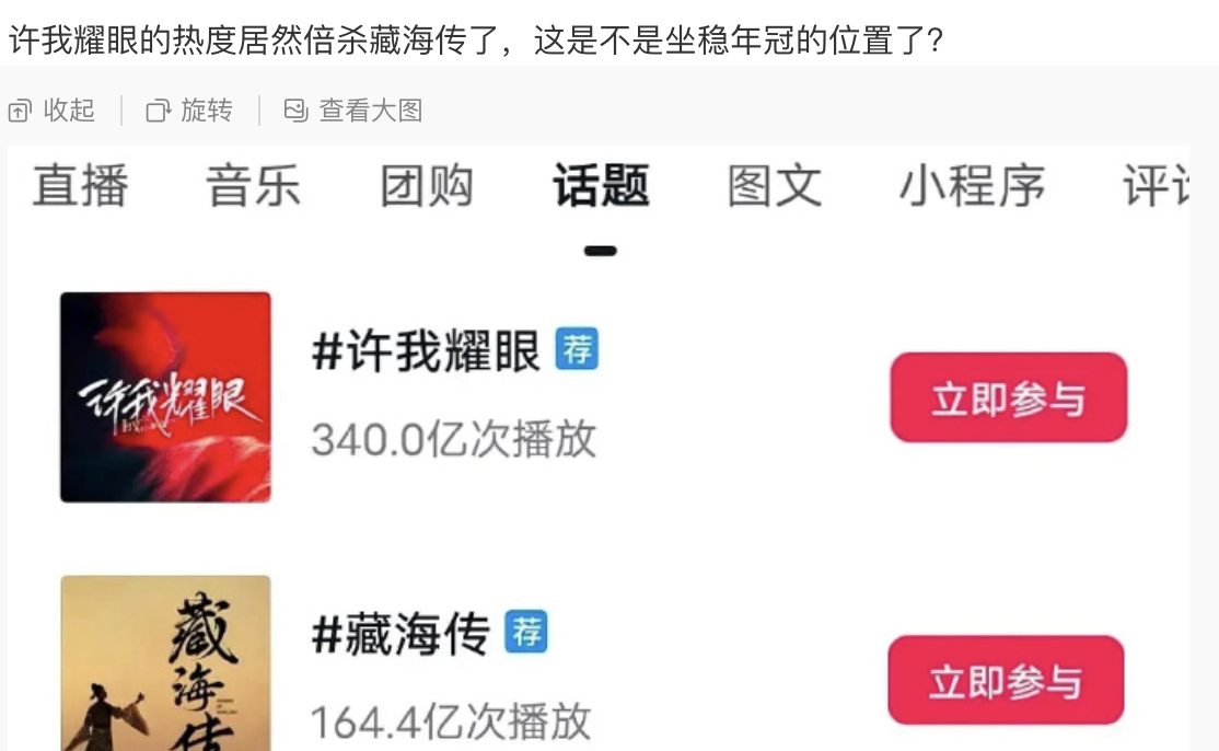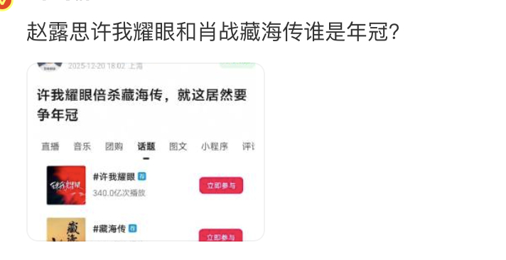 搞不懂为什么要去炒藏海传和许我耀眼的dou话题阅读量,难道现在谁是年冠dou说了