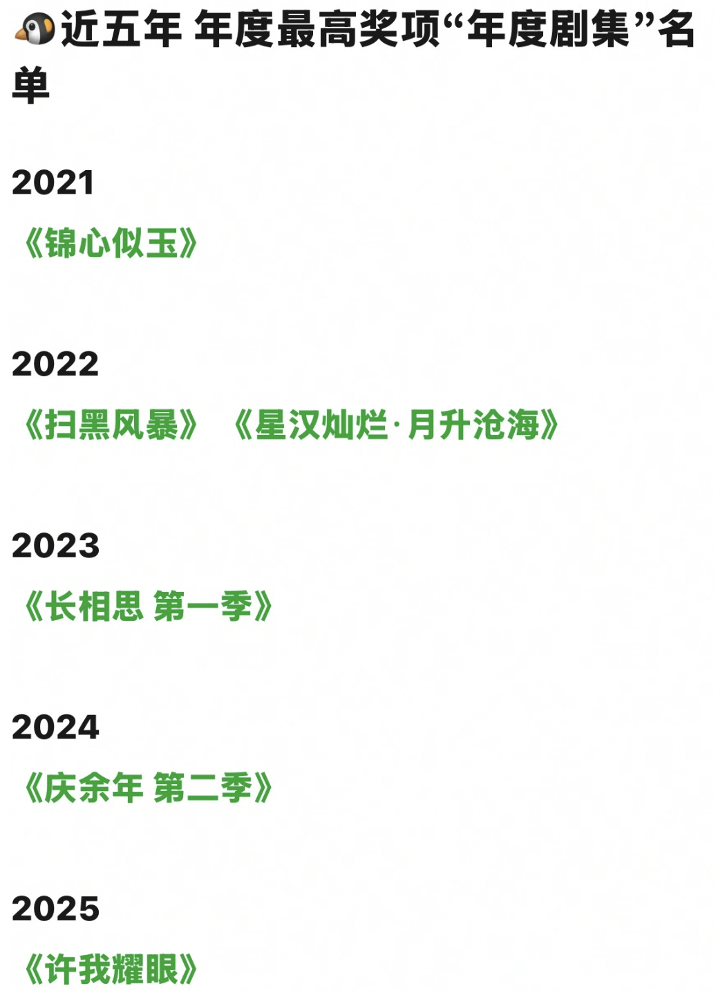 腾讯近五年年度剧集许我耀眼、庆余年2、长相思1、扫黑风暴+星汉灿烂、锦心似玉,好想知道锦心似玉怎么做到的,2021年发生了什么,有没有人帮我回忆下? 许我耀眼获奖